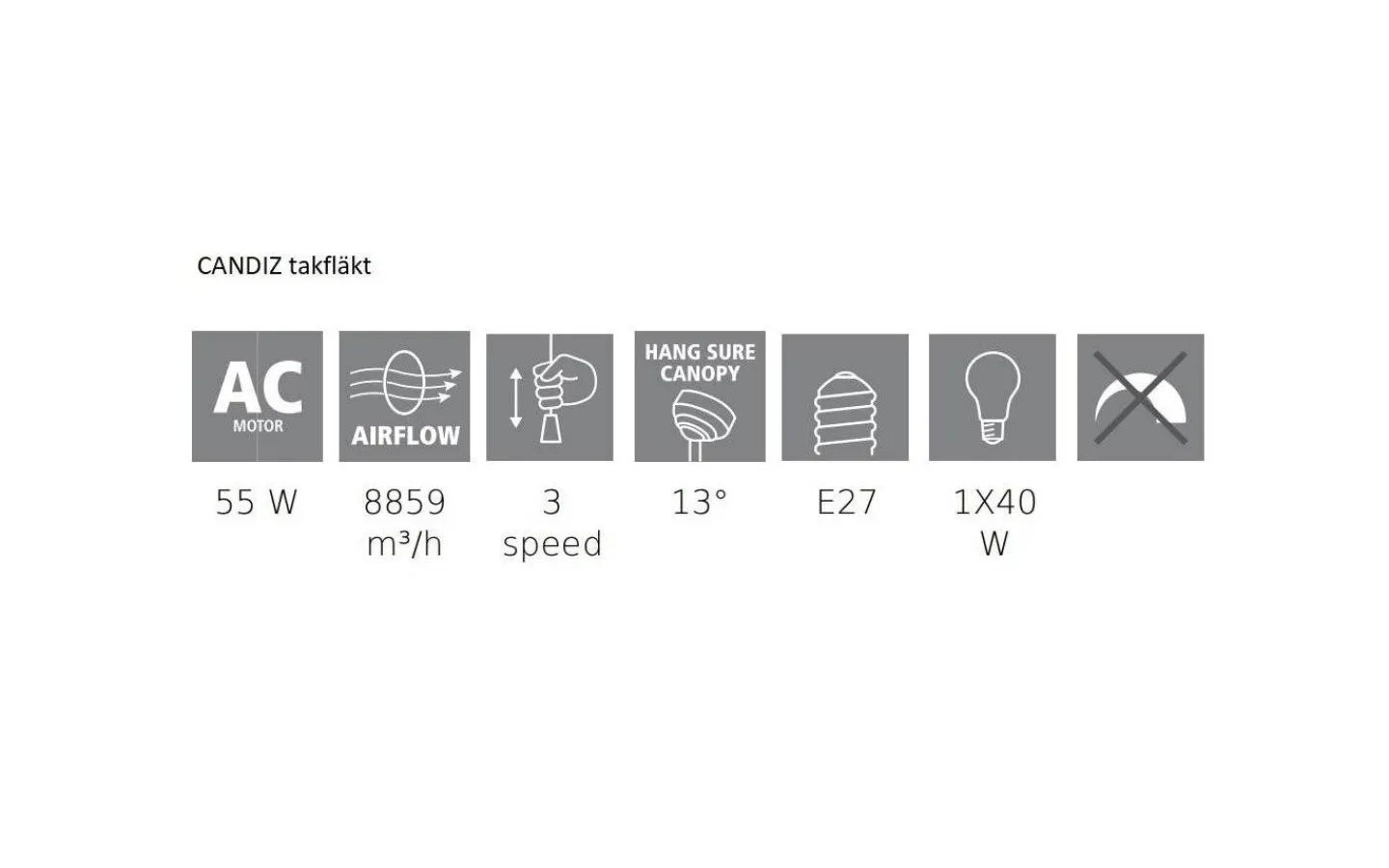 Candiz tystlåtna motor är energisnål och låter dig styra fläkten i 3 olika hastigheter. Den är även reversibel så att du får ut det mesta av din takfläkt och kan ha nytta av den både under varma sommardagar och under kyliga vinterdagar. Du startar, ändrar hastighet, byter riktning och stänger av fläkten via dragströmbrytaren.
