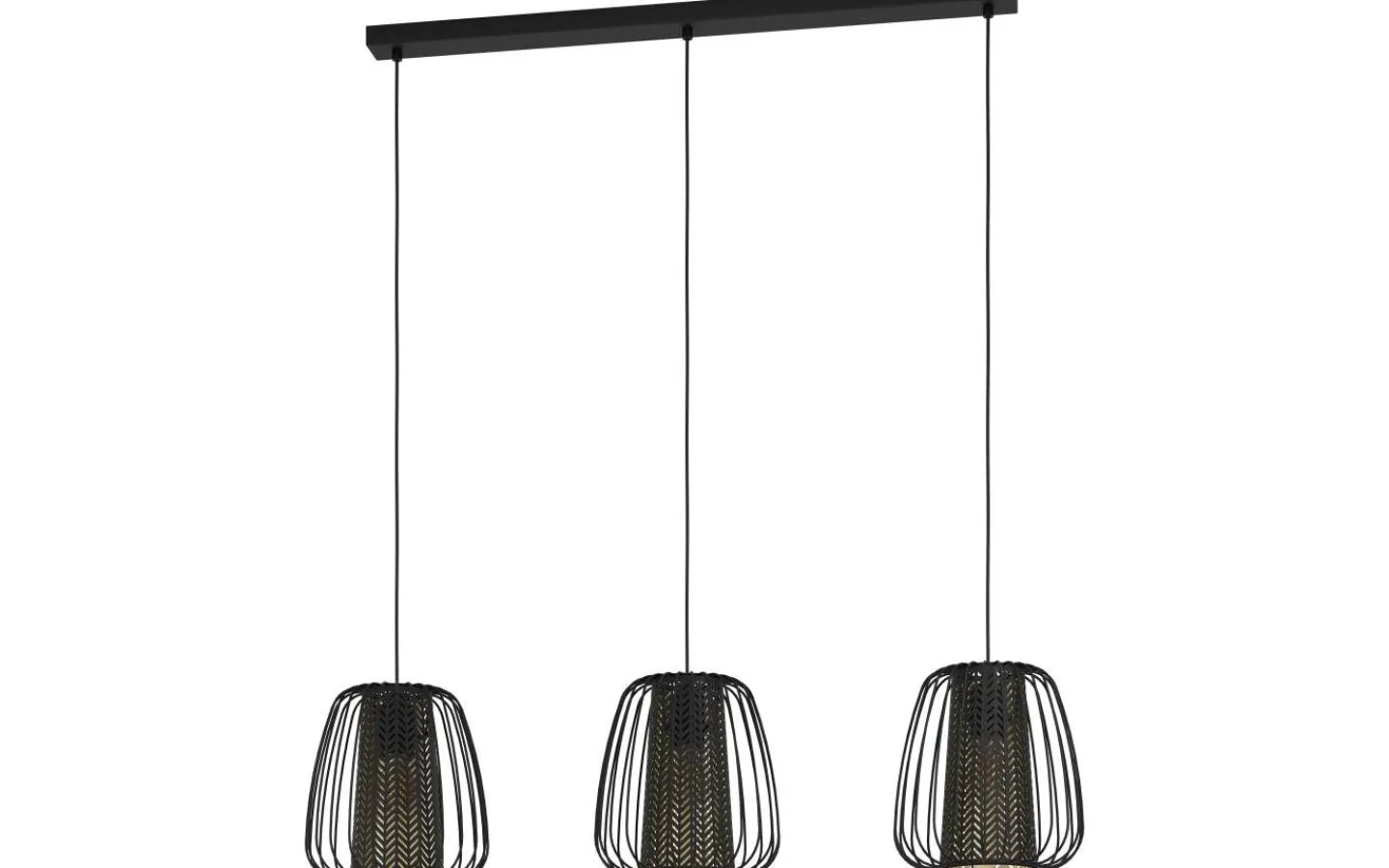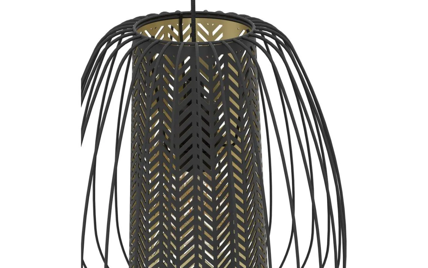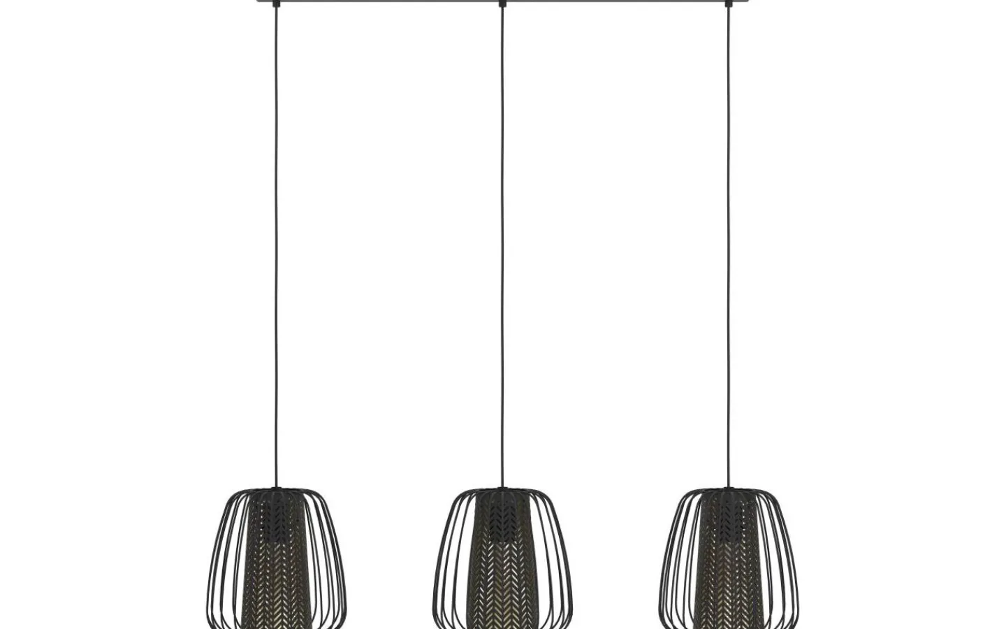 Pendellampan CURASAO har tre rundade svarta lampskärmar som var och en omger en inre tygcylinder. De svarta tygskärmarna har gulddetaljer och fina utskärningar som skapar en dramatisk ljuseffekt och ett fascinerande spel av ljus och skugga. Med sin övertygande kombination av metall och tyg, kompletterar taklampan enastående moderna interiörer och skapar den rätta stämningen i alla utrymmen.