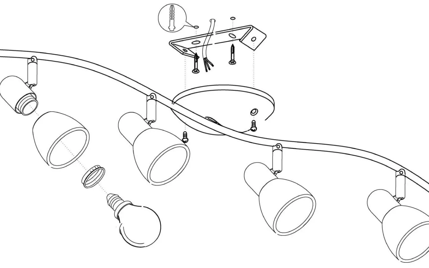 Taklampan DAKAR 1 har en mjukt böjd metallstomme i matt nickel i kombination med fyra justerbara spotlights. Strålkastarna har vita glasskärmar, dekorerade med en avtorkningsteknik, och kompletterar moderna inredningsstilar. Med sina svängbara lamphuvuden fungerar den klassiska takspotlighten bra i alla utrymmen, oavsett om det är köket, vardagsrummet, sovrummet eller hallen.