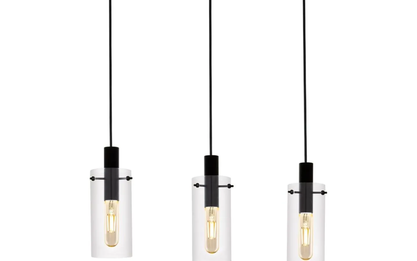MONTEFINO taklampa har tre hängande klarglascylindrar med lamphållare i svart metall. Produkten har en långsträckt svart metallkapell och en synlig glödlampsstil. Pendellampan är den perfekta pricken över i:et för moderna inredningsstilar och skapar snygg belysning i vardagsrummet eller matsalen.