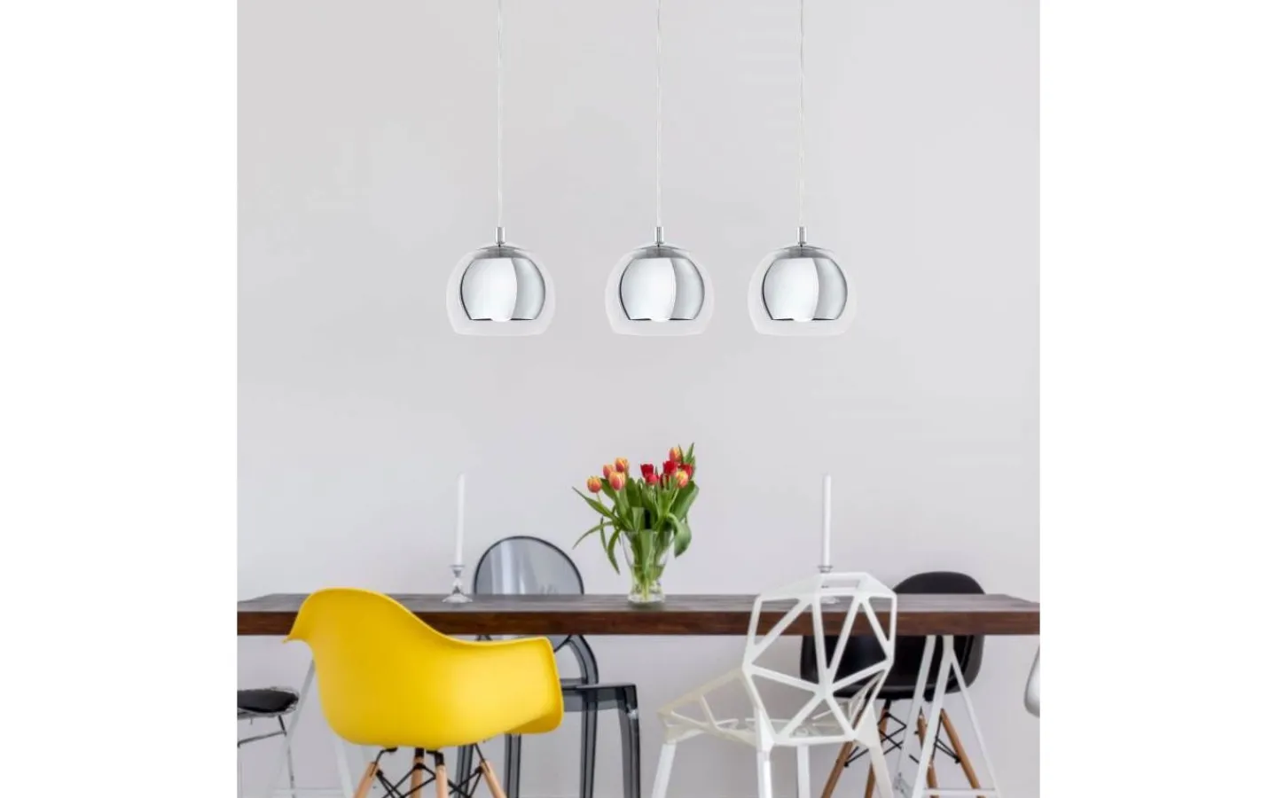 ROCAMAR taklampa har tre sfäriska skärmar av klarglas, som var och en omger en inre metallcylinder i kromfinish. Designen har en rektangulär kromfärgad metallkapell. Den eleganta taklampan har en enkel design och kompletterar utmärkt moderna interiörer och ger stilfull belysning i vardagsrummet eller matsalen ovanför matbordet.