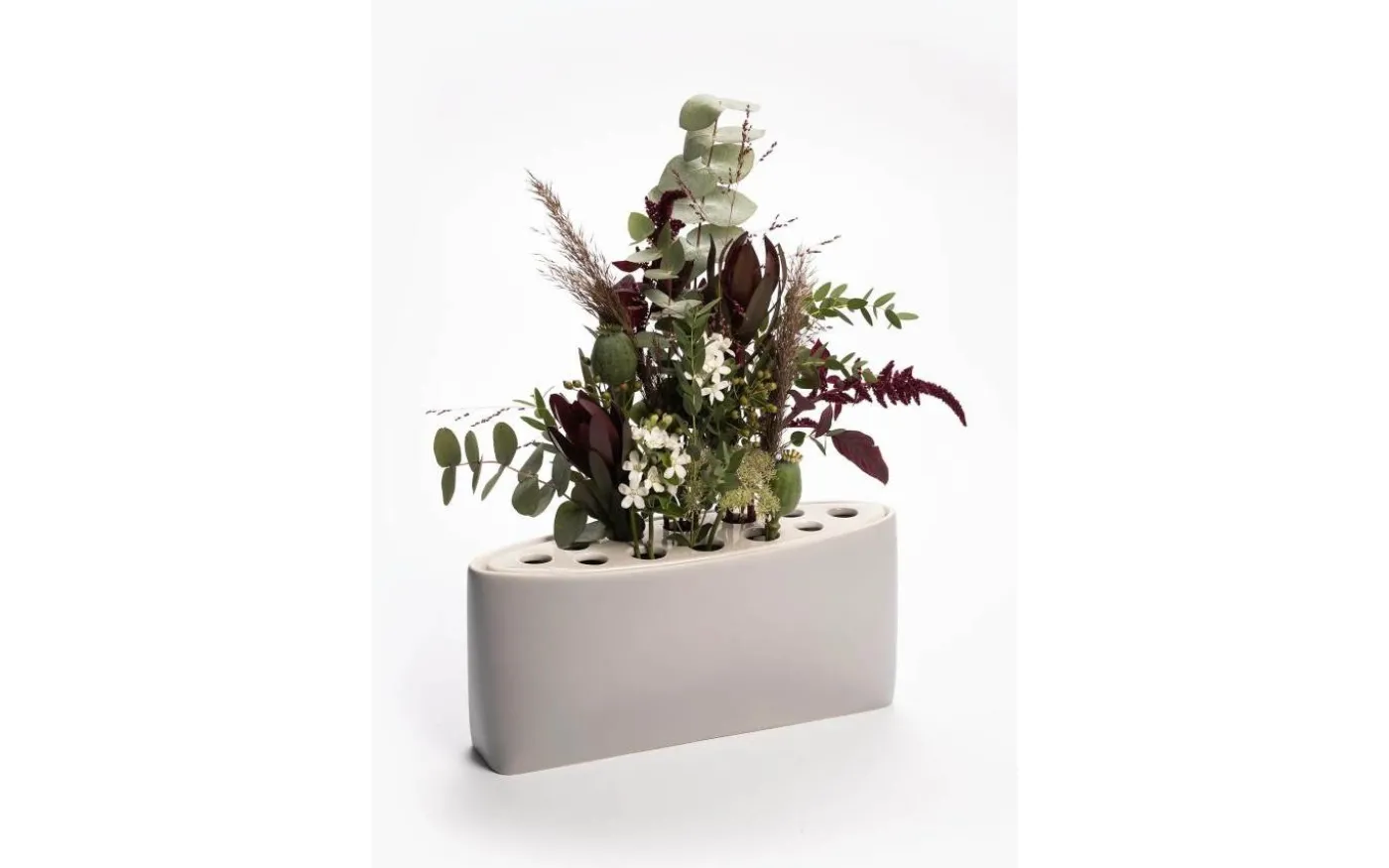 Grå funktionell vas i oval form med avtagbart lock. Matt vas och blankt lock ger en modern känsla. I locket finns 12 hål för blommor. Höjd 16cm, bredd 37cm. Gjord av keramik. Tillverkad i Europa. Designad av Emelie Grönvall.
