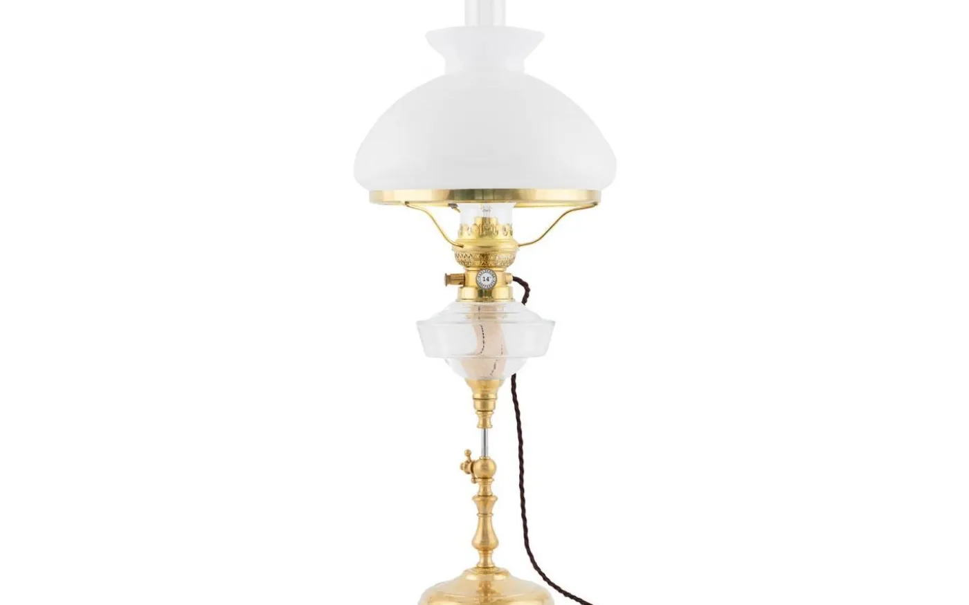 En magnifik elmonterad fotogenlampa på ställbar fot som verkligen fyller sin plats. Har i sitt originalutförande funnits i vårt sortiment sedan 1890-talet. Höjden på fotens metallstag går att reglera från 0 till 10 cm.
