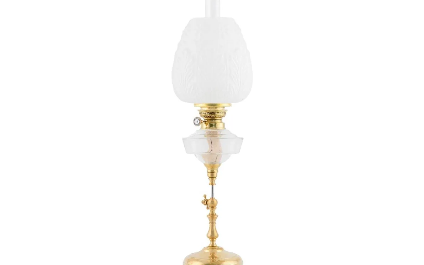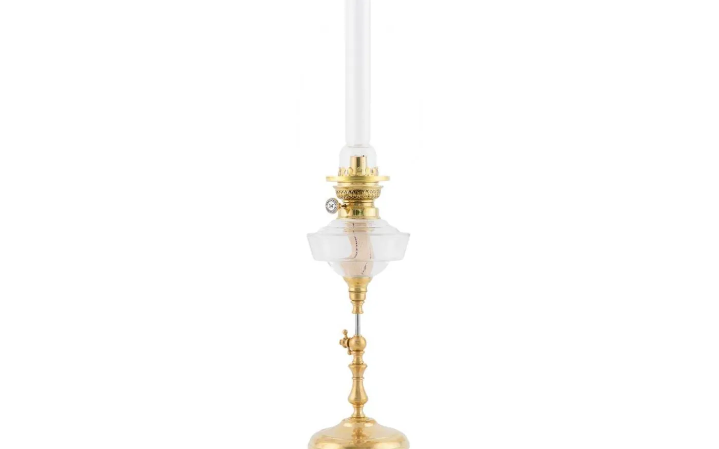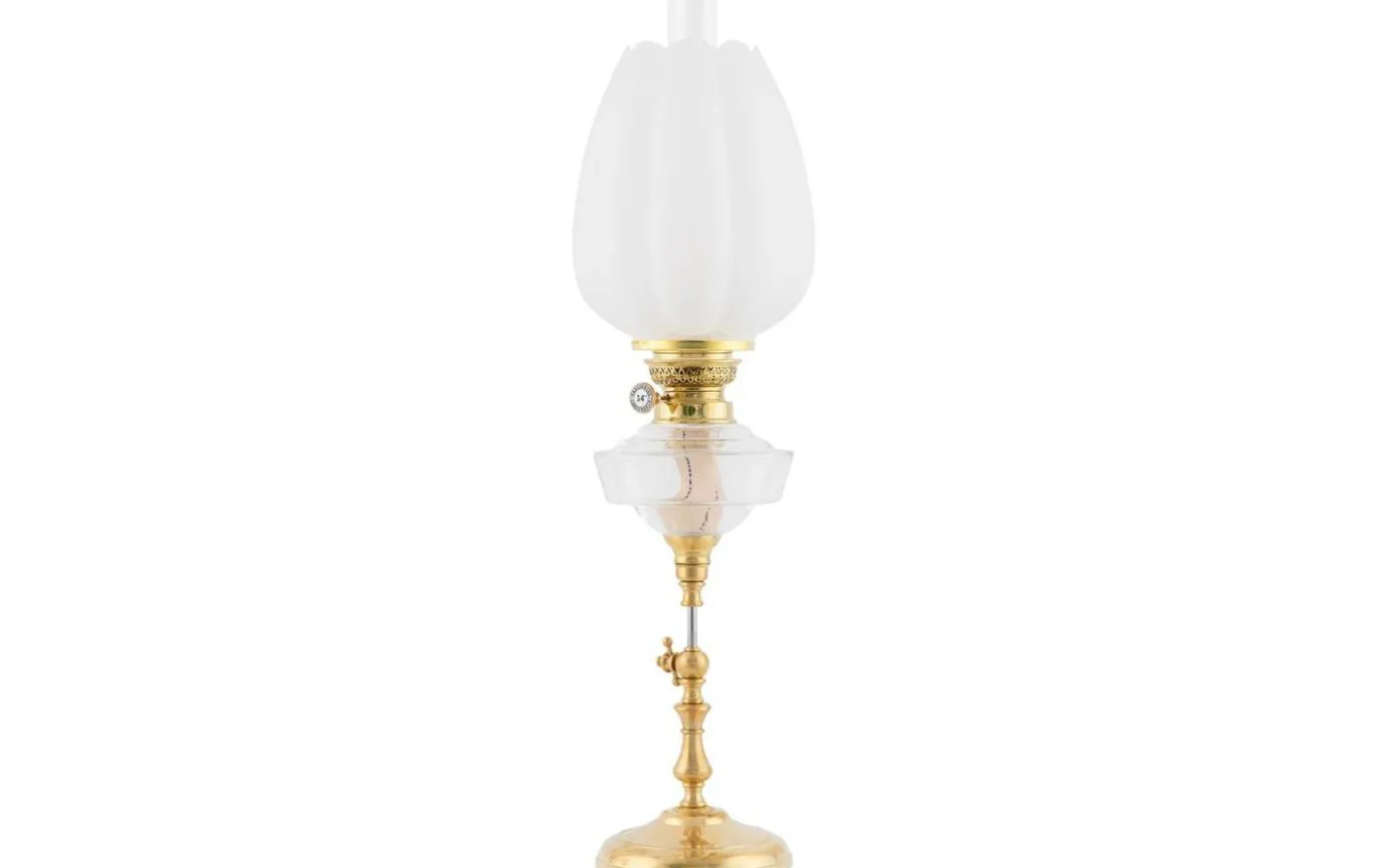 En magnifik fotogenlampa på ställbar fot som verkligen fyller sin plats. Har funnits i vårt sortiment sedan 1890-talet. Höjden på fotens metallstag går att reglera från 0 till 10 cm.