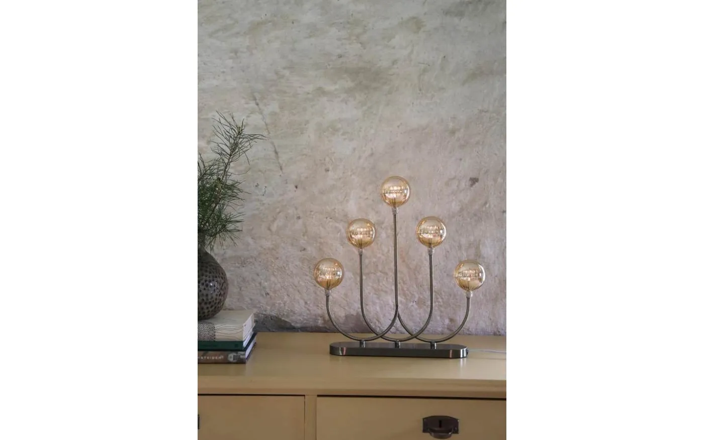 Enys ljusstake från Markslöjd. Ljusstake i antik mässing och 5st amber färgade glaskulor. 2m vit pvc kabel med brytare och väggkontakt. 5xE5, Max 0,8W. Ljuskällor ingår.