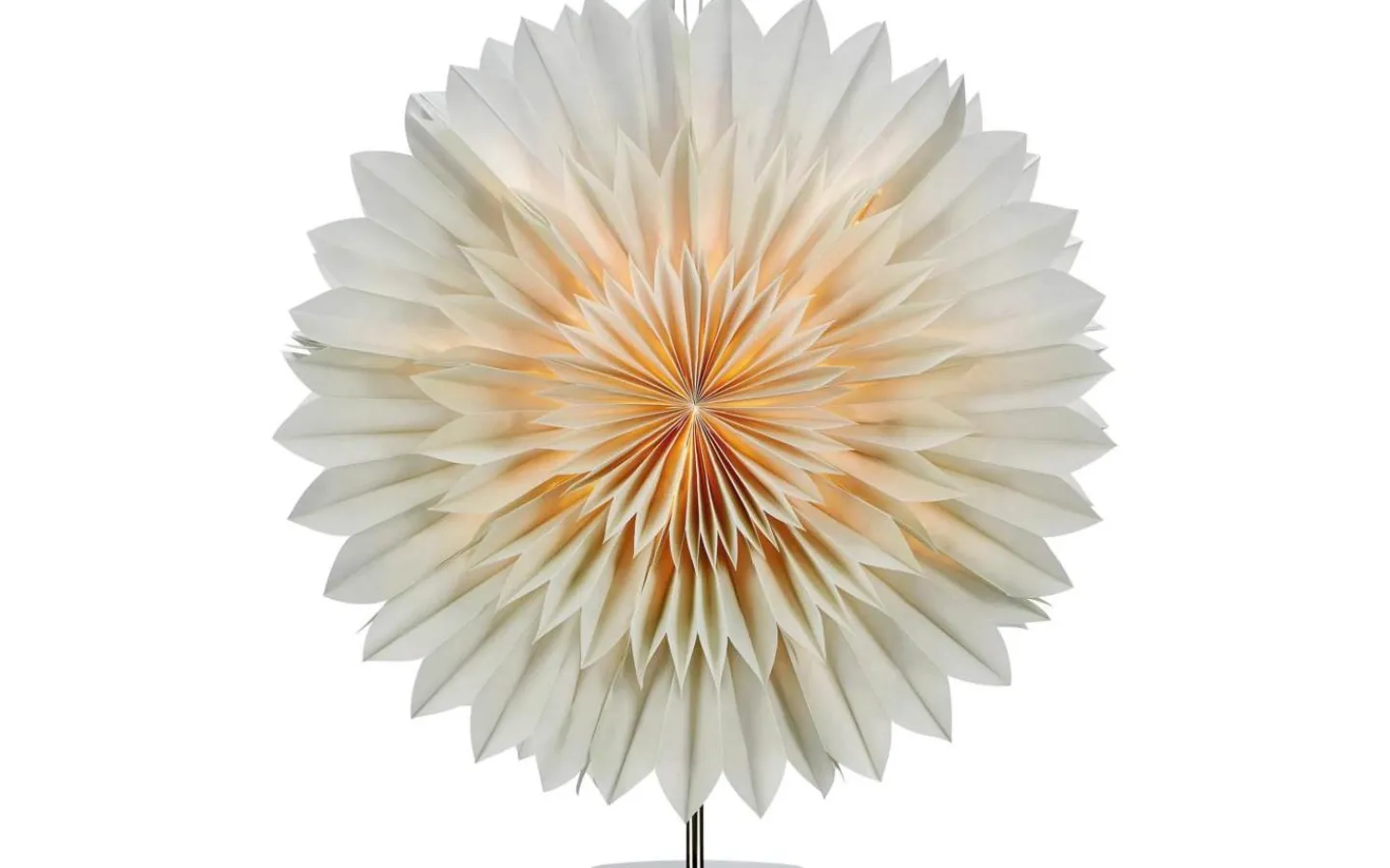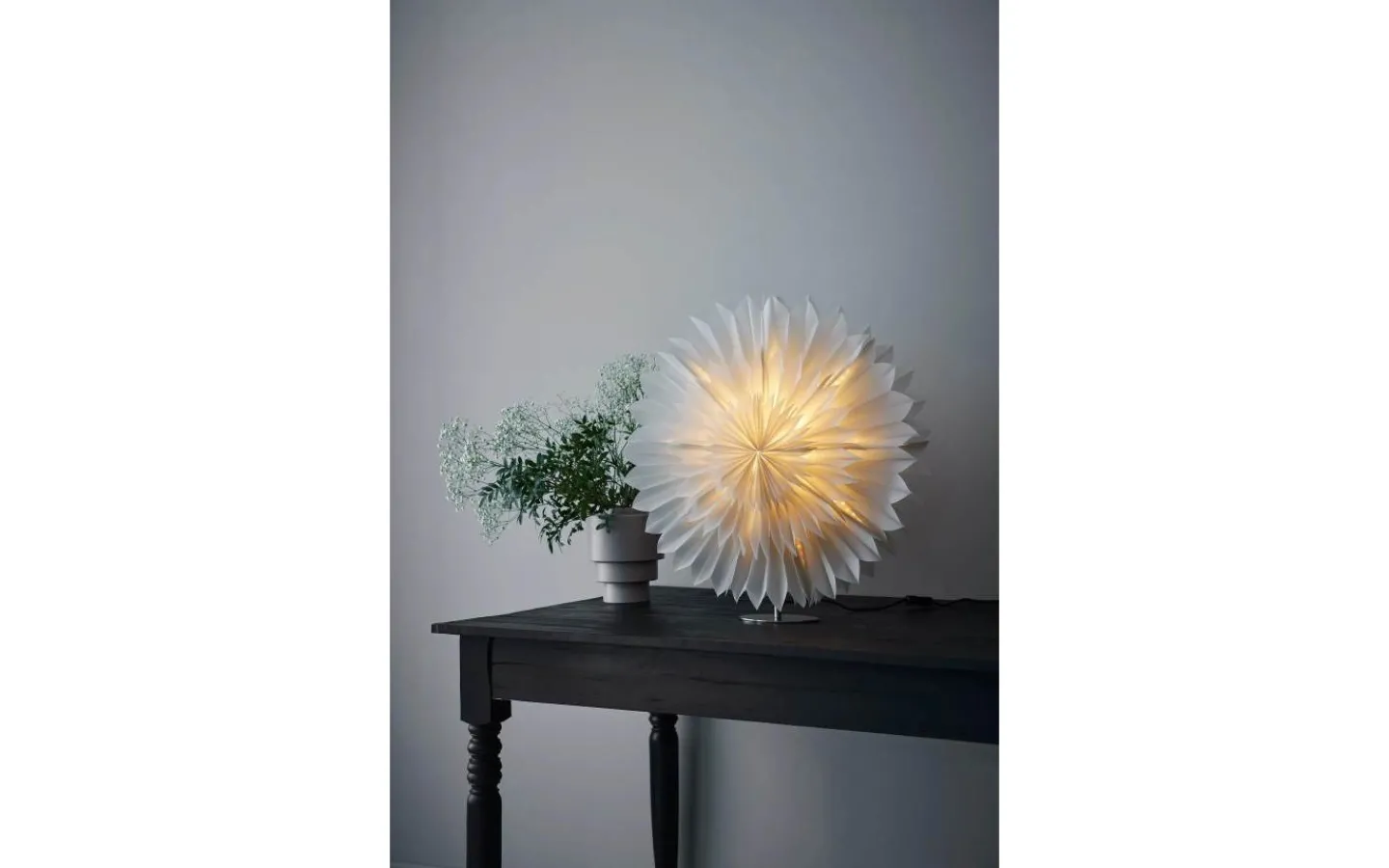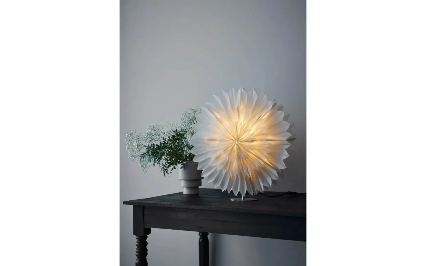 Skapa julstämning i fönstret med den här vackra bordsstjärnan. Adventsstjärnan har en detaljrik, grå skärm i papper och en stilren fot i metall. Solina är en stor bordsstjärna med en diameter på 60cm. Tekniskt: Lampan kräver en glödlampa med liten sockel (E14) om max 6W, ingår ej. 2m svart sladd med strömbrytare.