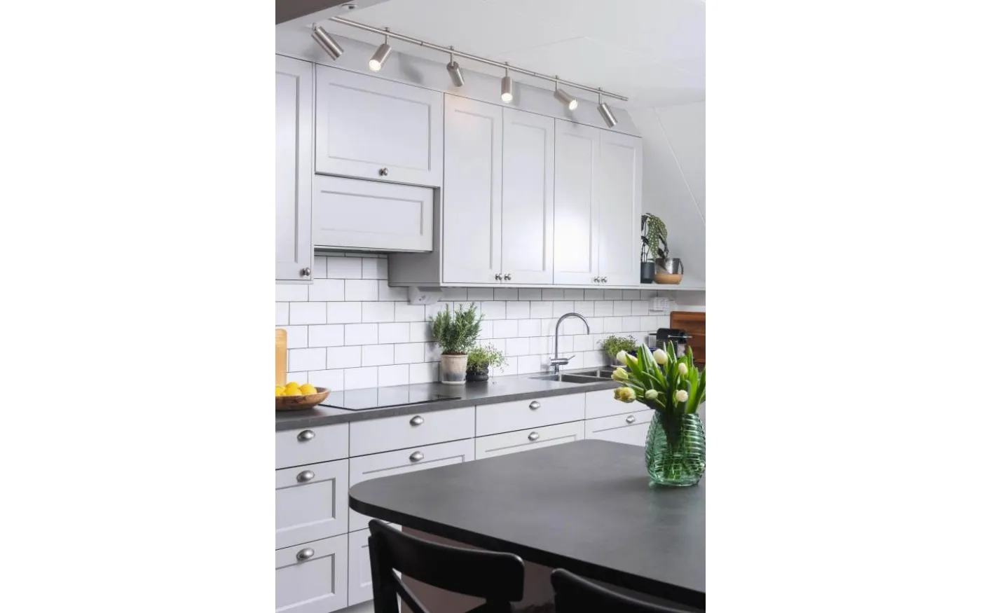 Priset inkluderar en styck skena á 70 cm med 2 styck armaturer. Tillbehör så som anslutningskabel, vinkelkoppling och ljuskällor säljes separat. Till denna belysningsskena behöver du 2 ljuskällor i LED med GU10-sockel. Komplettera med några av våra ljuskällor i LED som inte utsöndrar värme, har låg energiförbrukning och väldigt lång livslängd. Se passande förslag under ”Tillbehör”.