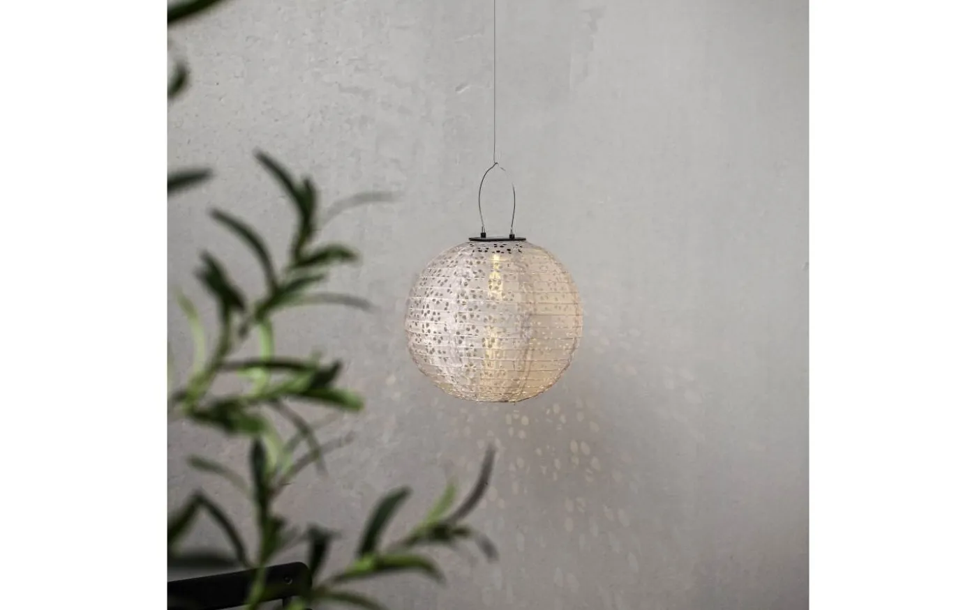 Solcellslyktan Festa är gjord av polyester med hålmönster som ger ett vackert skuggspel när den lyser i mörkret.
