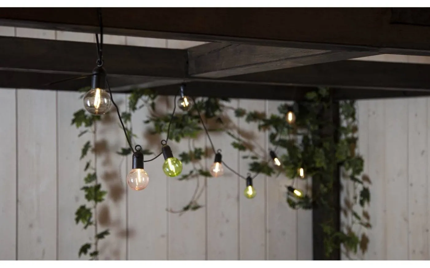 Fiesta är en fin, batteridriven ljusslinga, från välkända varumärket Star Trading, som passar perfekt till att dekorera balkongen eller uteplatsen med. Ljusslingan är 3,6 meter lång och har 10 stycken färgglada lampor med inbyggd LED som avger ett dekorativt, varmvitt ljussken. Det är 40 cm mellan varje lampa.