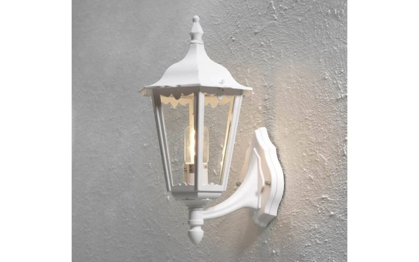 Denna stilfulla och eleganta vägglykta är gjord av aluminium och snyggt lackerad i vitt med klart glas med ljusspridning både framåt, mot fasaden och åt sidorna.