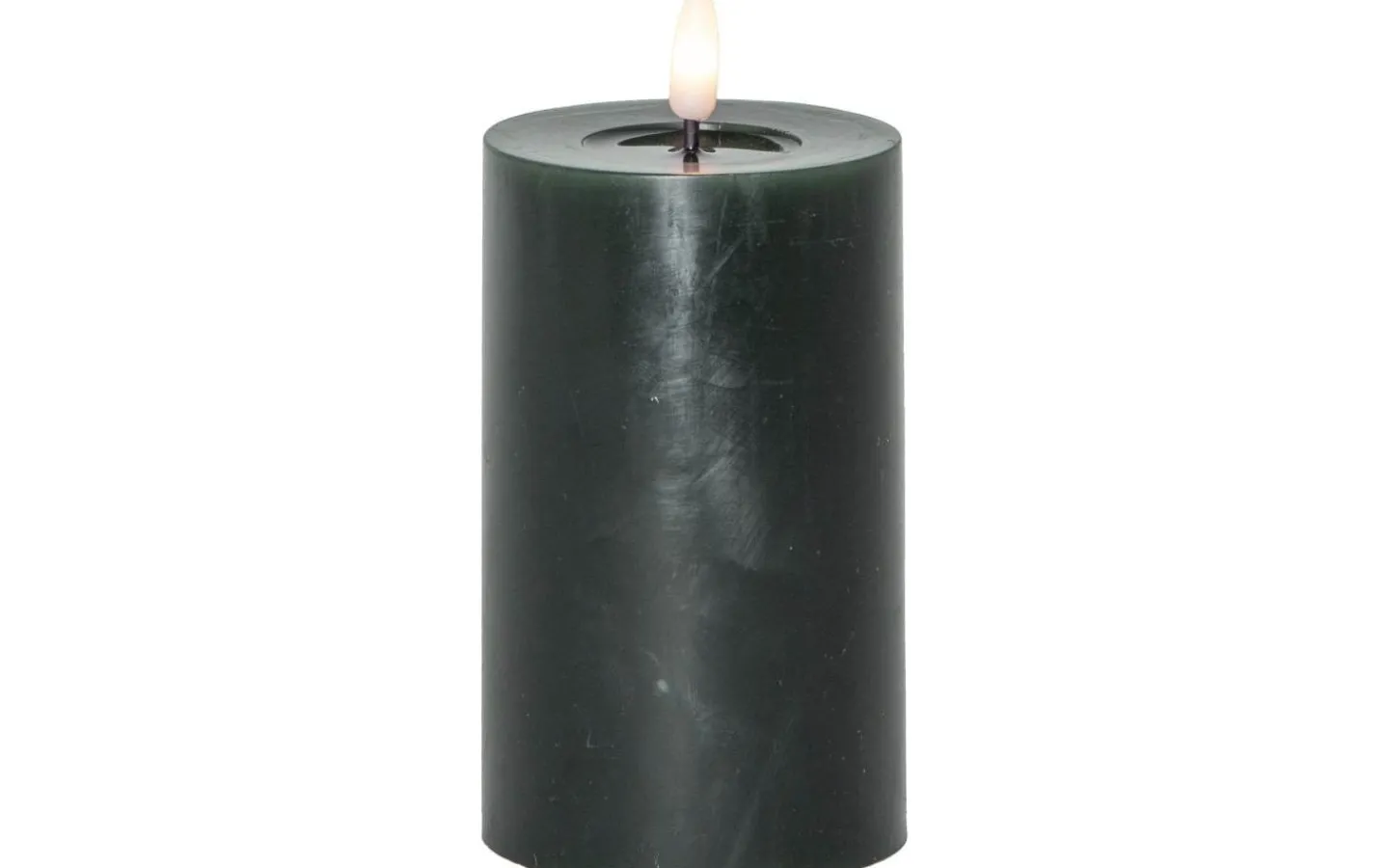 Ljuset har en svart veke med rund 3D-låga som lyser i ett mysigt varmvitt ljussken. Lågan skiftar i ljusstyrka för att avge ett vackert och verklighetstroget intryck.