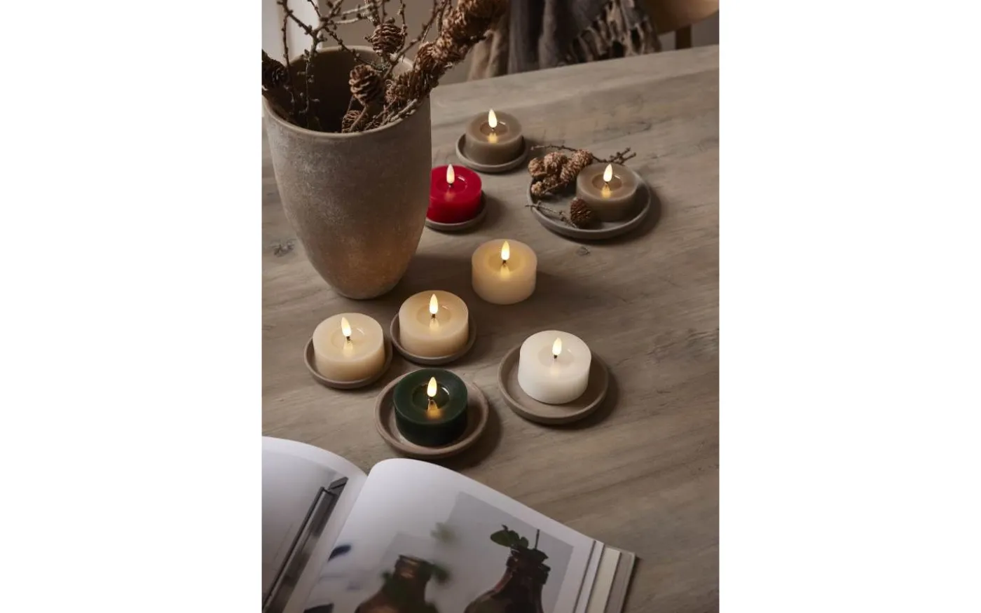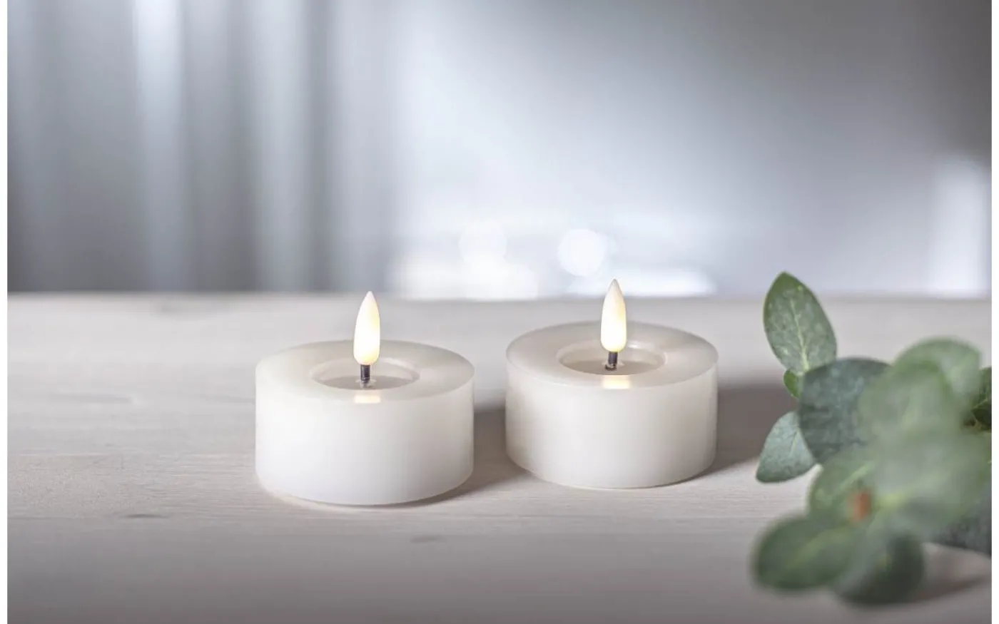 Flamme Flow XL värmeljus från Star Trading är ett 2-pack batteridrivna värmeljus i vax med en nersänkt blank yta som gör att det liknar flytande vax. Den naturtrogna runda 3D lågan är placerad på en svart veke och lyser i ett härligt varmvitt sken. Ljuslågan skiftar i ljusstyrka för att avge ett extra verklighetstroget intryck.