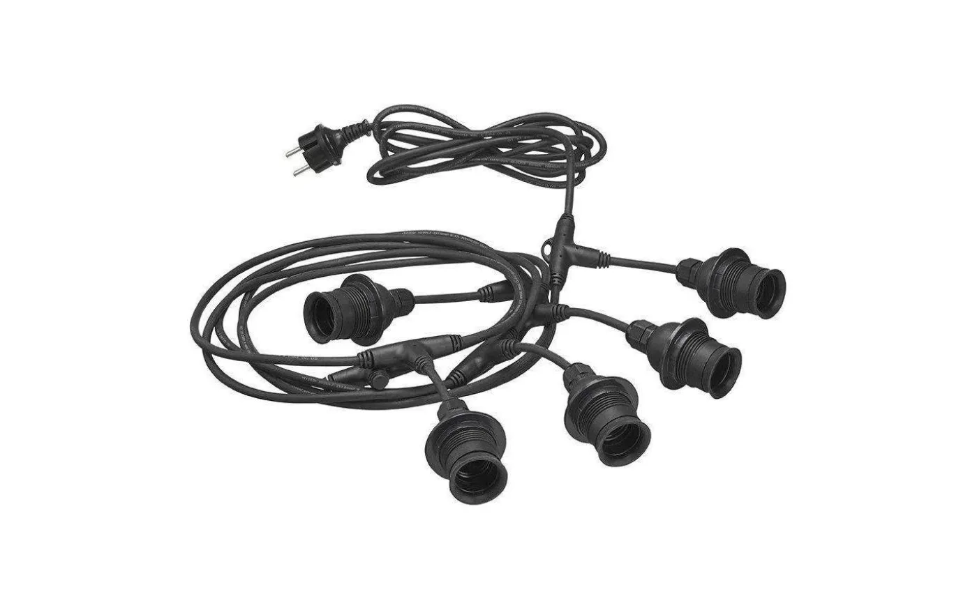 Flex Out ljusslinga från PR Home är 6,5m lång och försedd med 5st E27 lamphållare. Från stickkontakten fram till första lamphållaren är sladdlängden 2,5m sedan har lamphållarna ett avstånd på 0,8m.