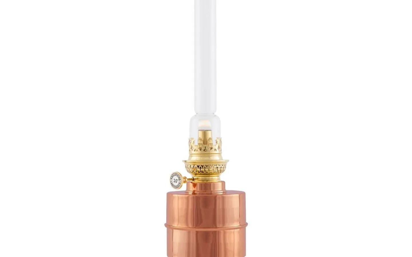 En klassisk fotogenlampa som med sitt cylinderformade oljehus helt i mässing ger ett funktionellt och lite modernare intryck -trots att ursprungsmodellen har anor från det sena 1800-talet.