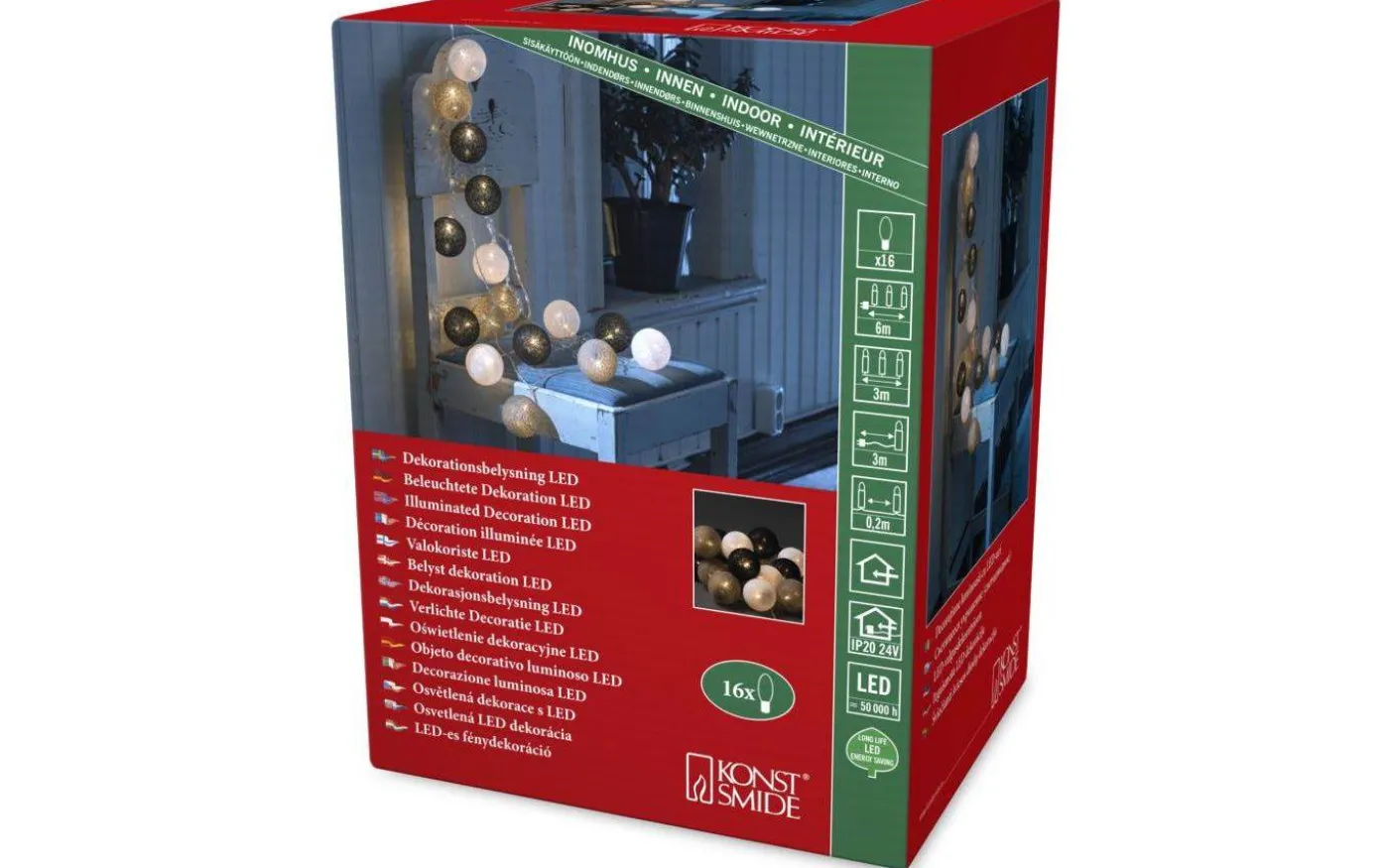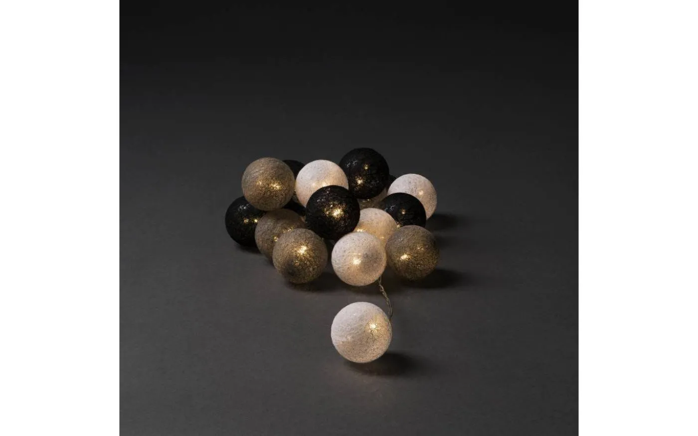 Garn ljusslinga från Konstsmide är 3m lång och har 16st dekorativa bollar av garn i färgerna vit, grå och svart. Inuti varje garnboll sitter en liten LED-lampa som lyser upp i ett härligt varmvitt ljussken.