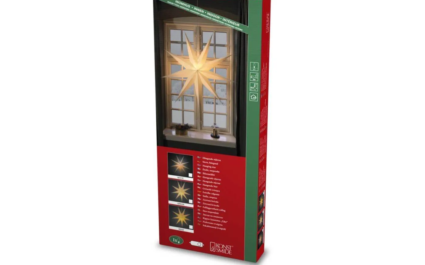 Glada julstjärna från välkända Konstsmide är en vacker julstjärna i papp. Julstjärnan levereras med en 5 meter lång anslutningskabel med strömbrytare och stickkontakt för vägguttag.