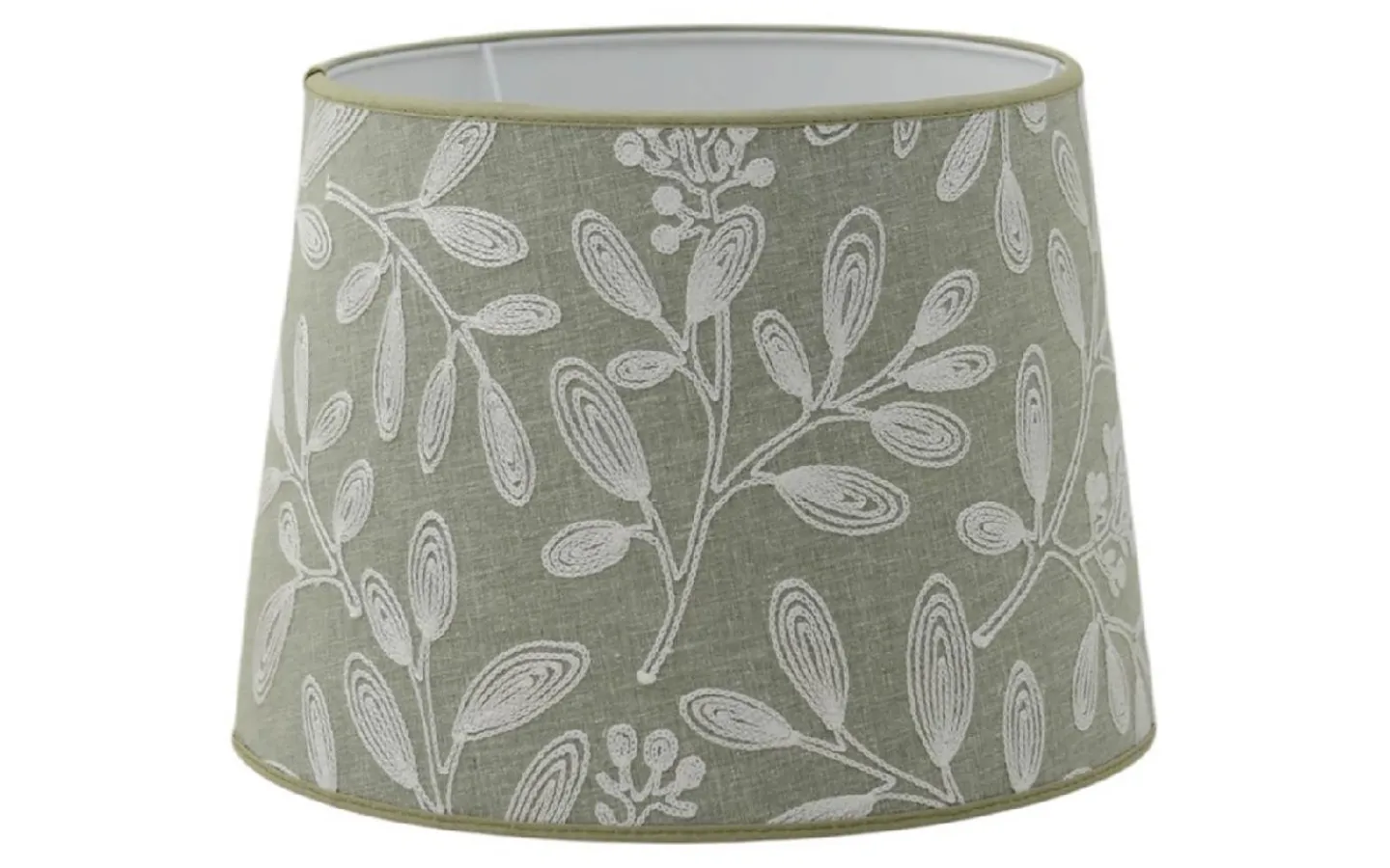 Charlotte är en rund lampskärm i dämpad grön ton med vackert broderat mönster som ger ett mjukt och levande uttryck även när lampan är släckt. Den klassiska formen gör att skärmen passar på de flesta bordslampor och bidrar med ett varmt, ombonat ljus. Det naturinspirerade broderiet lyfter helheten och tillför en dekorativ detalj i rummet utan att ta över.