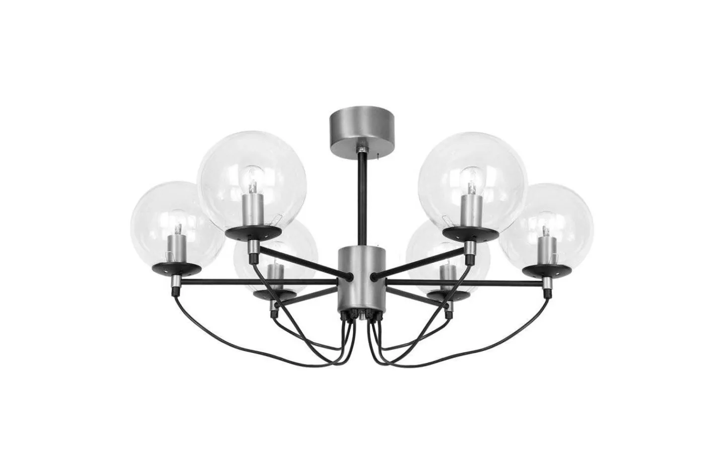 Lampan har stomme i svart metall med detaljer i borstad silver kombinerat med sex runda glaskupor i klarglas. De synliga, svarta kablarna ger lampan ett modernt och industriellt uttryck och blir en härlig kontrast till metallen.