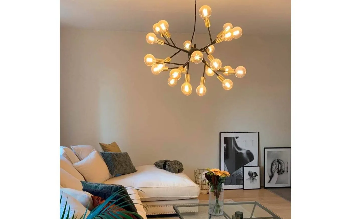 Taklampan består av flera armar som håller totalt 24 stycken E27-socklar med plats för valfria ljuskällor. Vi vill tipsa om att välja ut dina favoriter och blanda ljuskällor i olika storlekar för ett livfullt intryck och ett riktigt toppresultat. Välj att kombinera ljuskällor 80 mm, 95 mm och 125 mm, se passande förslag under ”Tillbehör.” Observera att välja ljuskällor med samma färgtemperatur (Kelvin/K) oavsett storlek! Önskar du hellre ha en och samma storlek på alla ljuskällorna fungerar detta givetvis också bra.