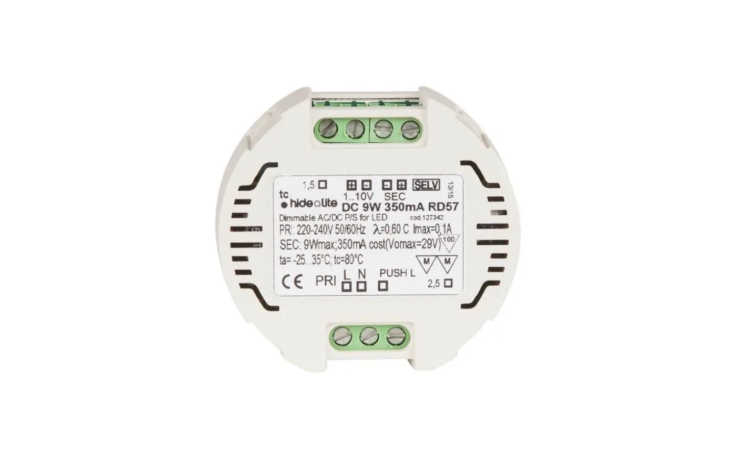 Dimbar via Push (230V) eller 1-10V. Jolly Round har skruvplintar som klarar kablar upp till 2,5mm² och minnesfunktion som tänder upp på senast inställda värde efter spänningsbortfall.