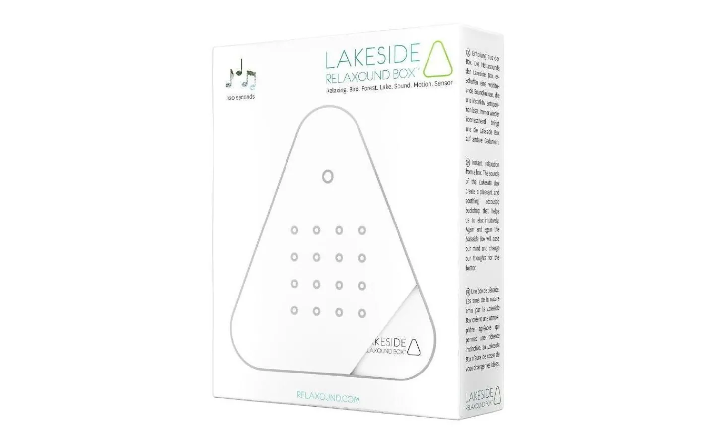 Speldosa. Färg: Vit. Mått: Längd 11 cm Bredd 2,80 cm Höjd 11,80 cm. Material: Plexiglas, ABS Plast. Speldosan ”Lakeside” framkallar stunder av avkoppling i ditt liv. Lugnande naturljud tar dig till en idyllisk skogssjö: porlande vatten, kvittrande fåglar, spelande syrsor. Du kommer omedelbart att känna hur ditt huvud och din kropp slappnar av intuitivt. Du aktiverar speldosan när du passerar den och om ingen ny impuls följer tonar den ut efter två minuter. Oavsett om du har den hemma eller på kontoret, i badrummet eller i hallen kan du placera din speldosa ”Lakeside” var som helst eller helt enkelt hänga upp den på väggen.Ljud: vatten, fåglar, ankor, syrsorLjudlängd: 2 minuterAktivering: via rörelsesensor (reagerar på förändringar i ljuset)Teknik: laddningsbart batteri, USB-kabel ingårMaterial: plexiglas, ABS plastMått: Längd 11 cm Bredd 2,80 cm Höjd 11,80 cmVikt: 95 gPerfekt för: badrum, gästtoalett, entré, korridor, kontor