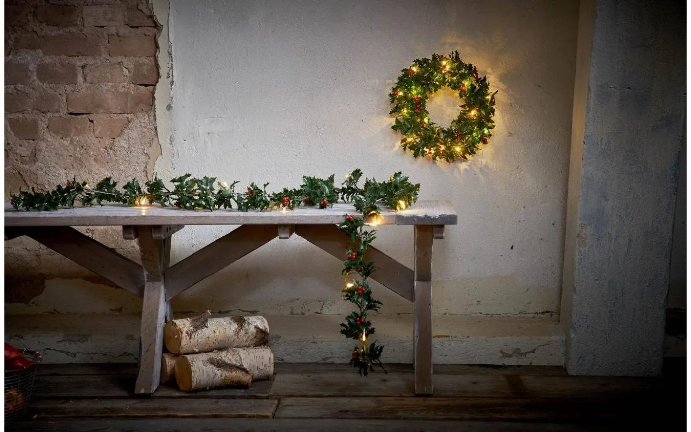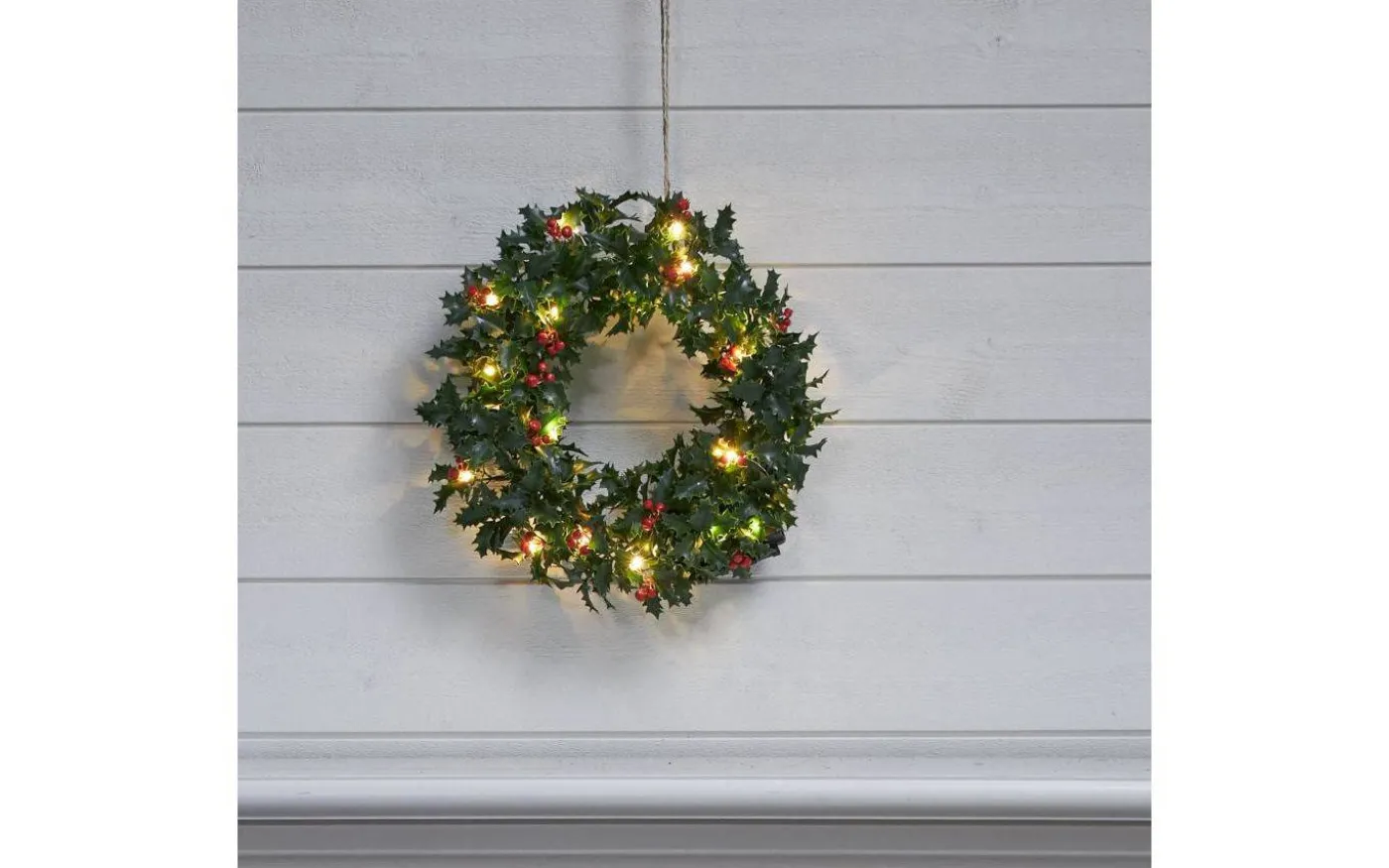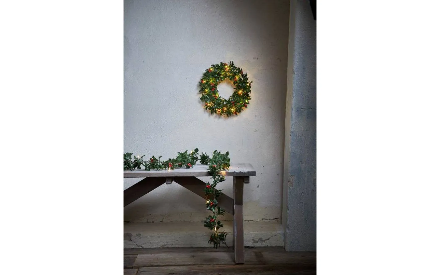 Vackra Holly från Star Trading är en batteridriven krans gjord av plast. I forn av järneksblad och små röda bär. Denna batteridrivna krans har 20 ljuspunkter som lyser i ett behagligt varmvitt ljus och skapar en mysig julkänsla.