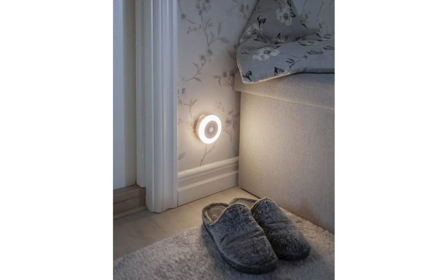 Batteridriven nattlampa med sensorfunktion. Nattlampan har två lägen, ett sensorläge vilket innebär att ljuset aktiveras automatiskt vid rörelse när det är mörkt. Sedan finns det ett ON läge vilket innebär att lampan lyser konstant. Du bestämmer själv vilket läge du önskar ha på nattlampan. Om du använder sensorläget så lyser lampan i 20 sekunder efter det att den känt av sista rörelsen.