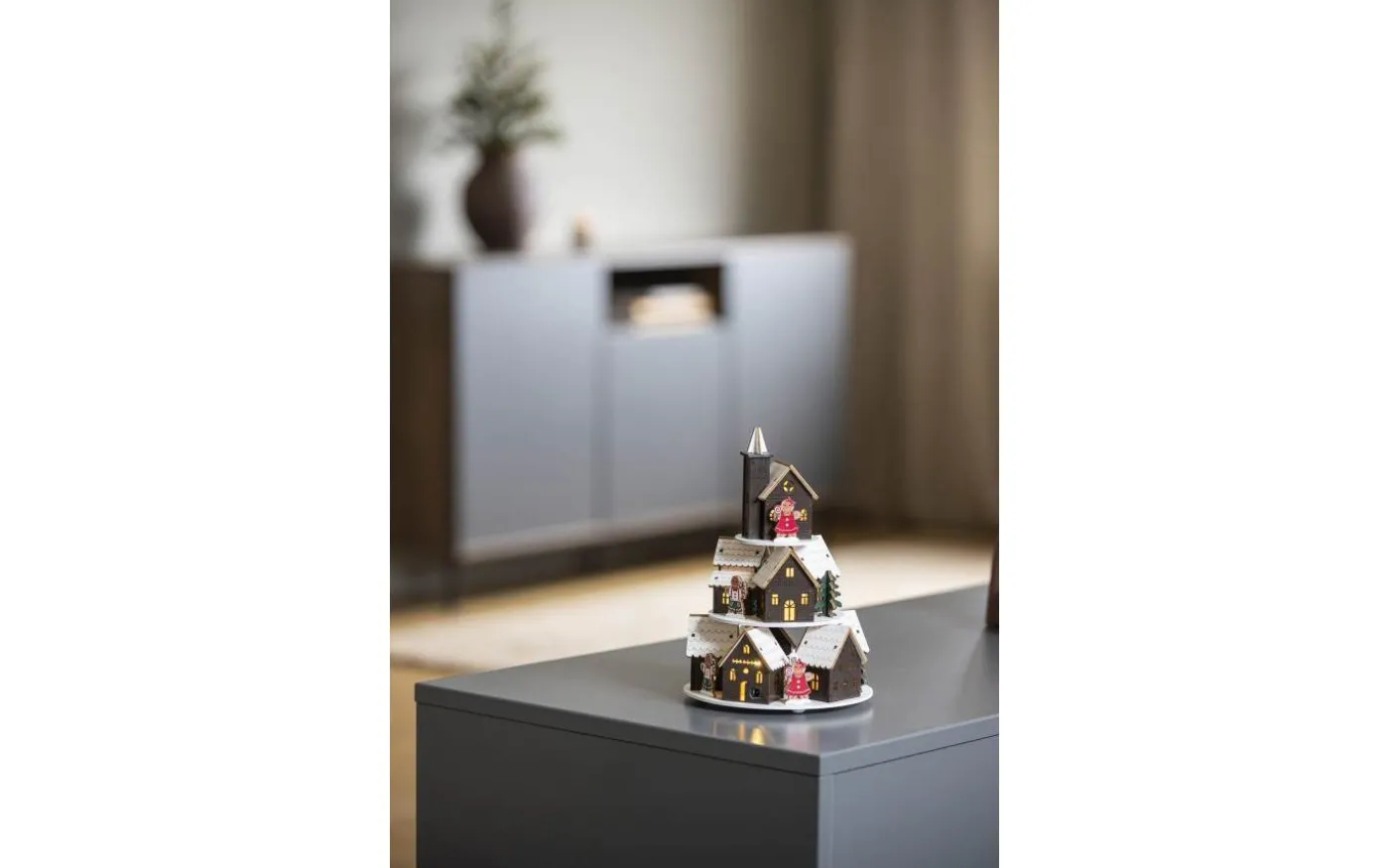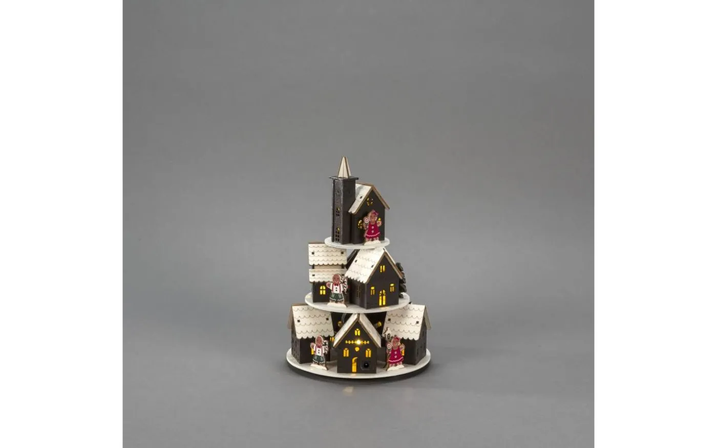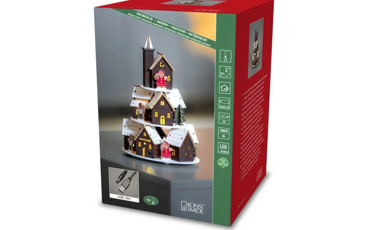 Sprid julstämning med denna charmiga julby! Med pepparkakshus, små pepparkaksgubbar och en vackert vintrig miljö fångar den känslan av en klassisk jul i miniatyr. De detaljrika figurerna i träsiluett skapar en varm och inbjudande atmosfär. Tack vare den praktiska 6‑timmars timern samt möjligheten till batteridrift eller USB‑anslutning, kan du enkelt placera den precis där du vill.