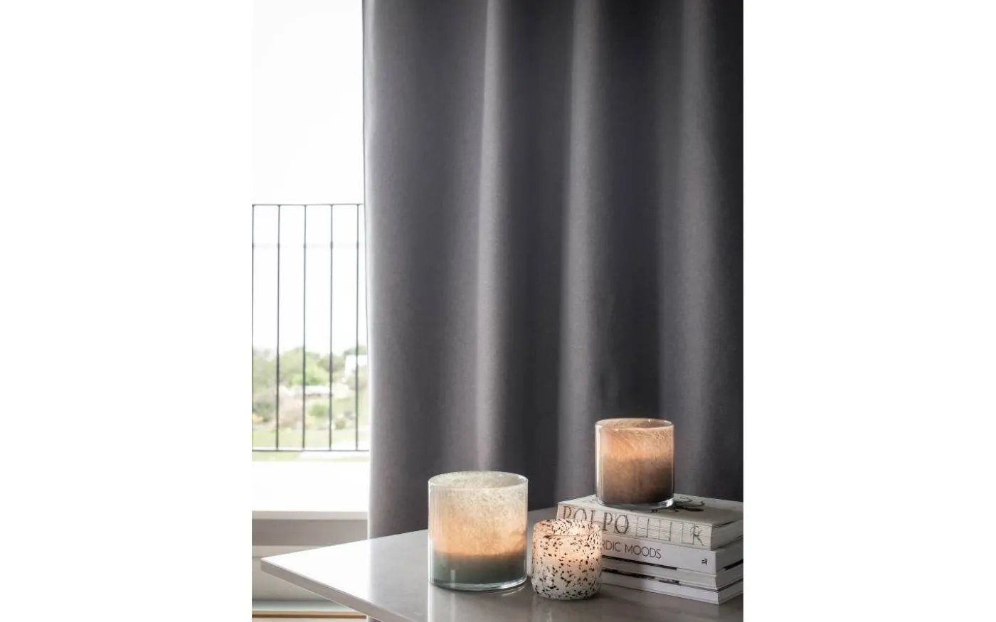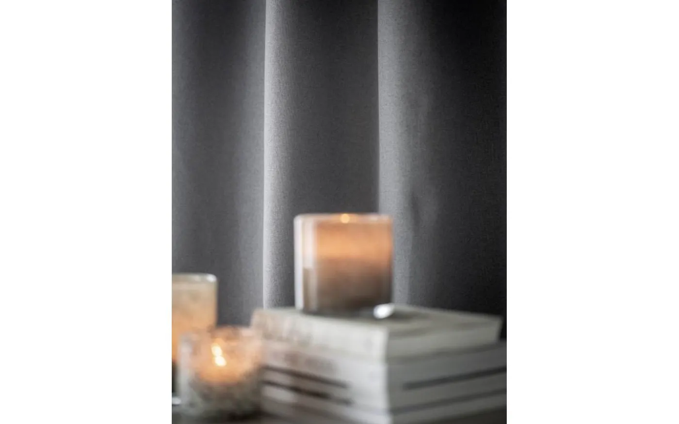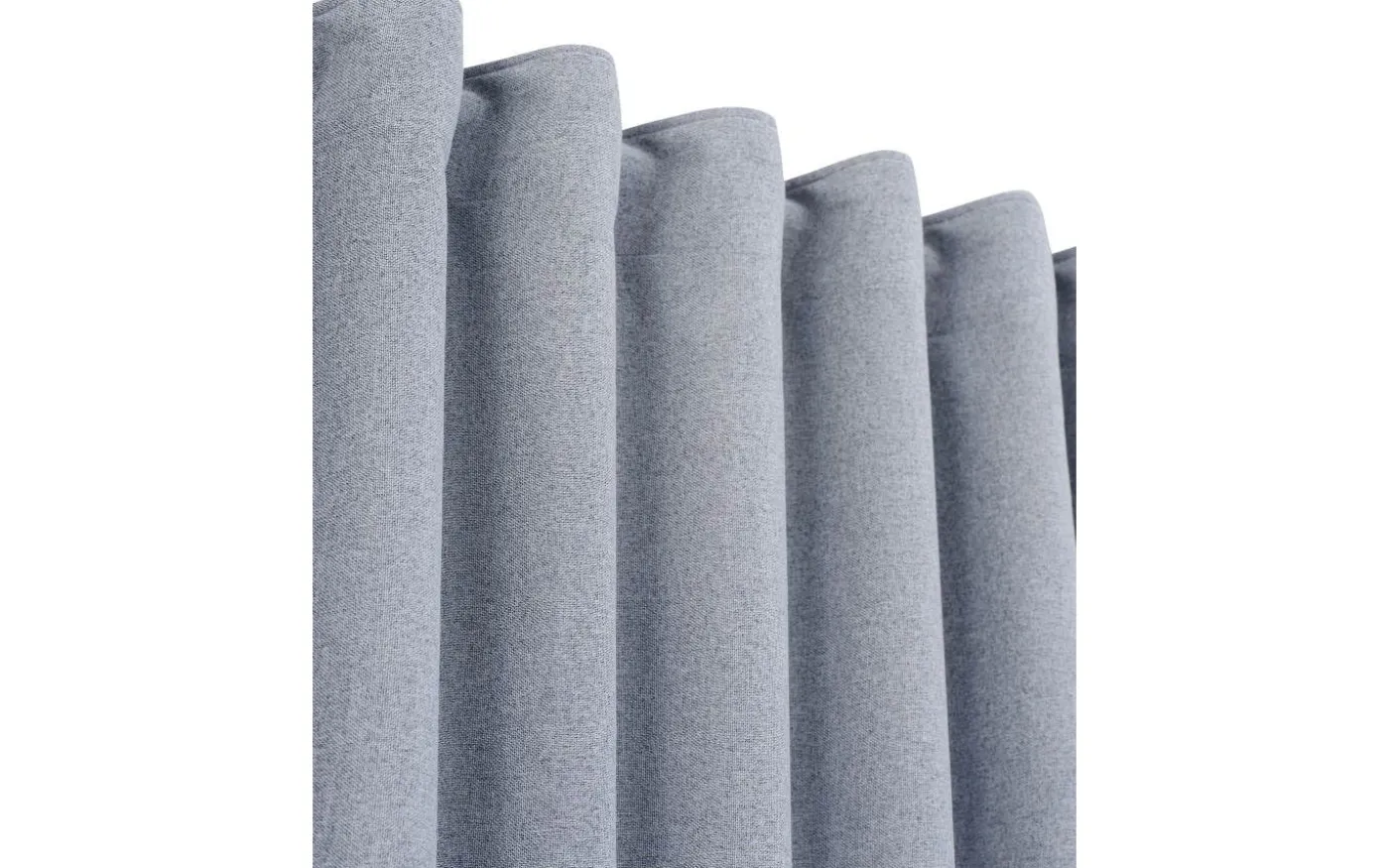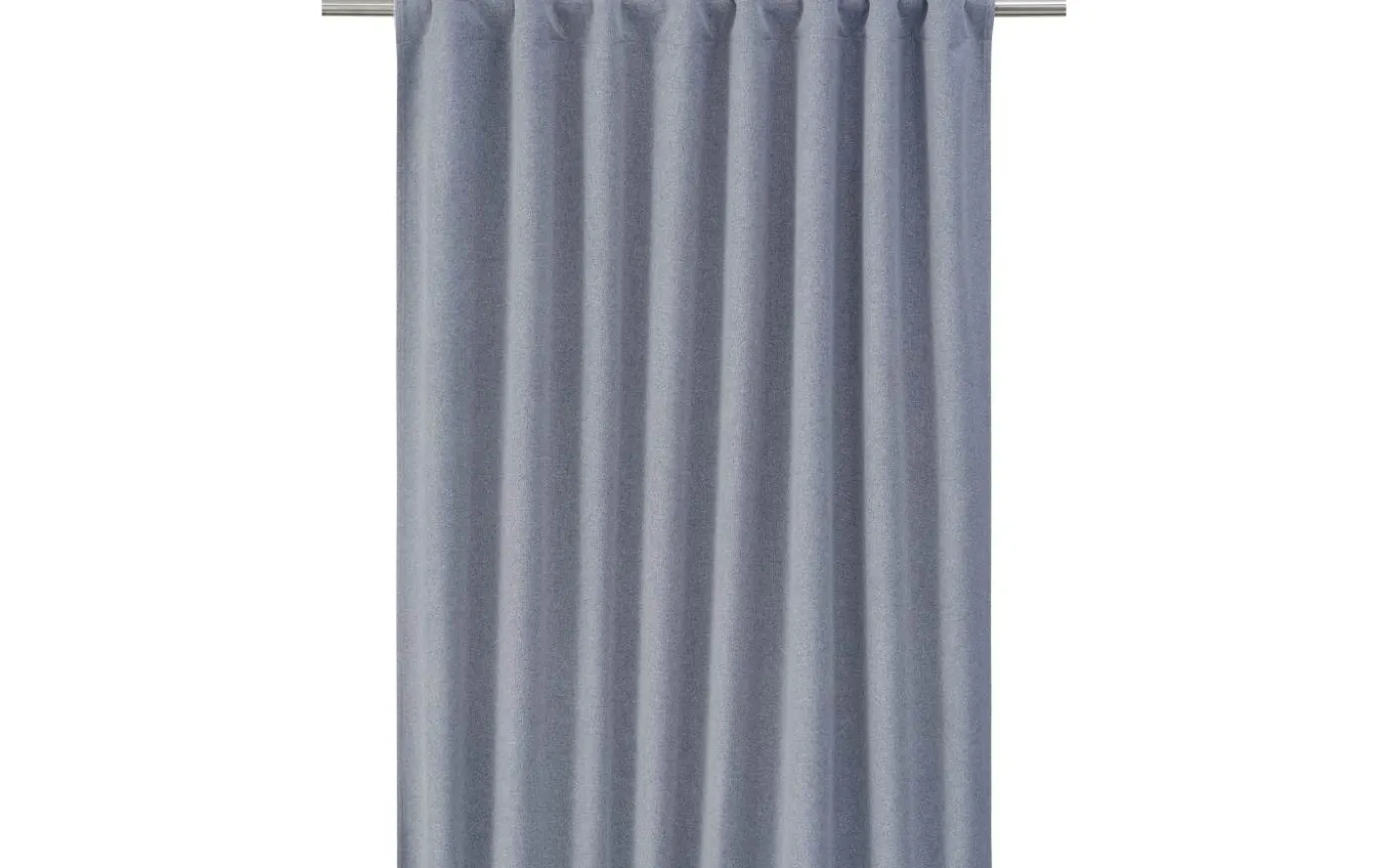 2-pack mörkläggningsgardiner med multiband i ovankant, fållade långsidor och overlocksöm i nederkant. Tyget har svarta trådar invävt i sig (som inte syns), dessa absorberar ljuset så att det inte tränger igenom. Mörkläggningseffekten är 100%.
