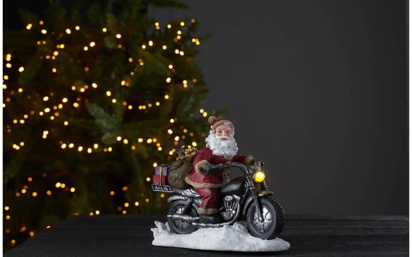 Merryville Panorama Motorcykel, från Star Trading, är en dekorativ juldekoration i formen av en tomte i farten på sin motorcykel med julklappar bakom sig. Lyset på motorcykeln lyser i ett gult ljussken som ger dekorationen en lekfull detalj. Passar perfekt att placera på en skänk eller i fönsterkarmen. Merryville Panorama Motorcykel kommer definitivt vara en mysig detalj bland julpyntet!