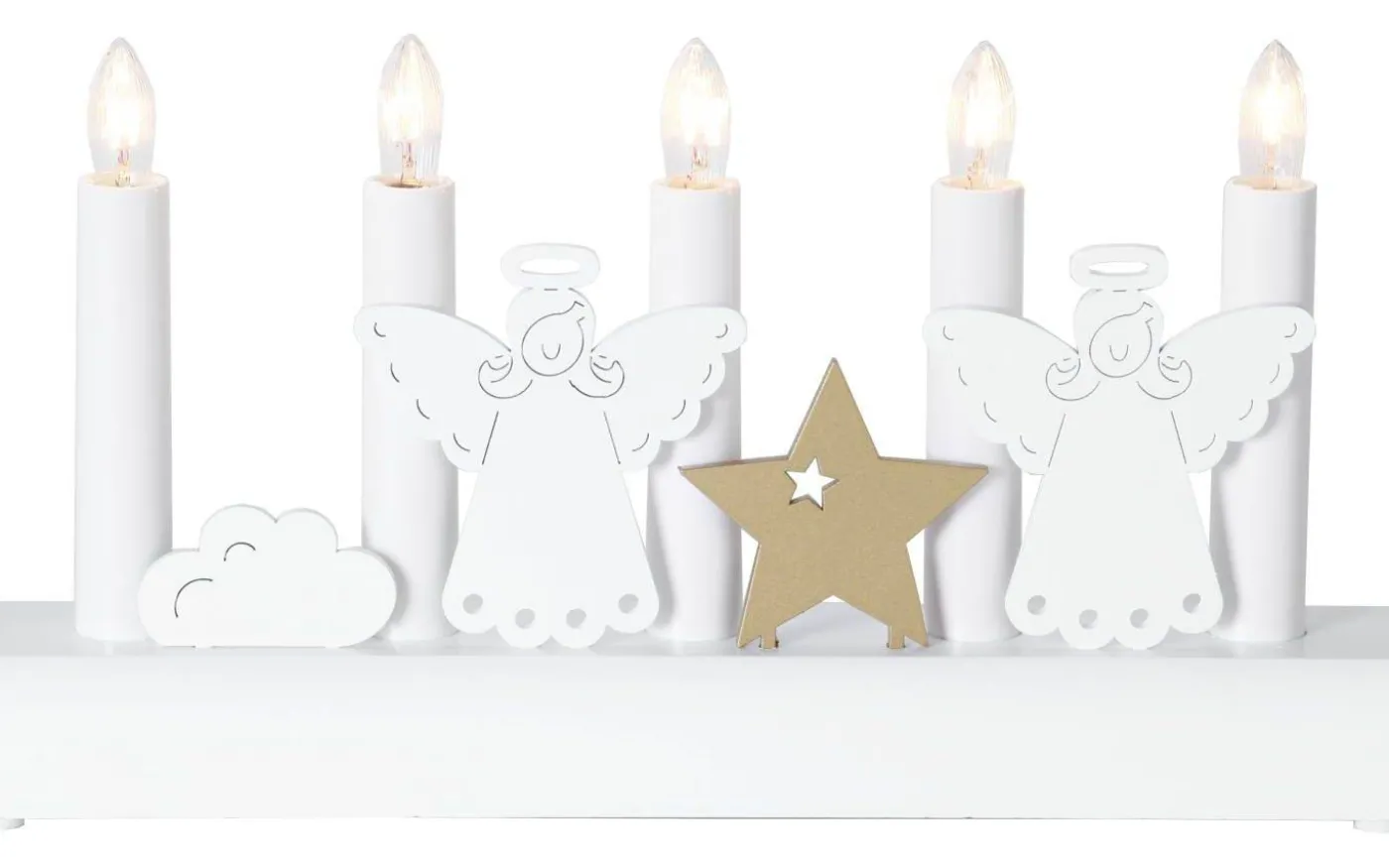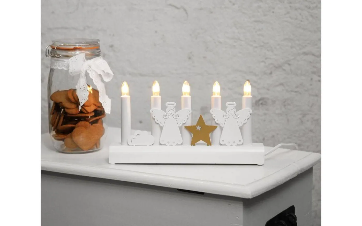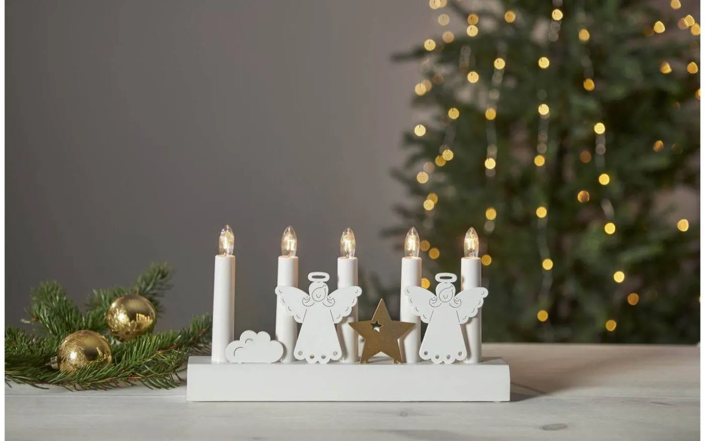 Söta adventsljusstaken Julia, från Star Trading, är en fin ljusstake i vitt trä med änglamotiv och en stjärna i guld. Denna fina 5-armade adventsljusstake gör sig lika vackert i barnrummet som i vardagsrummet och avger ett mysig ljussken i vintermörkret.