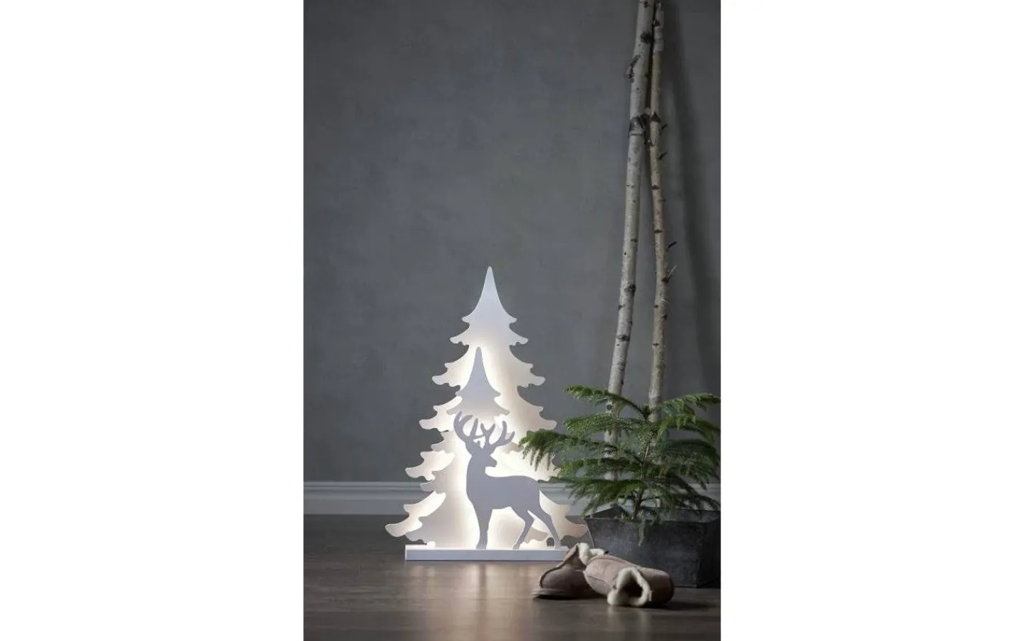 Vacker juldekoration i trä med silhuetter som avbildar en hjort och två granar. Mellan silhuetterna lyser ett behagligt ljus som ger en otroligt vacker effekt. Med sin höjd på 70 cm passar denna dekoration perfekt till dig som har stora fönster eller till dig som helt enkelt vill ha en pampig juldekoration. Finns även i större storlek på 110 cm hög.