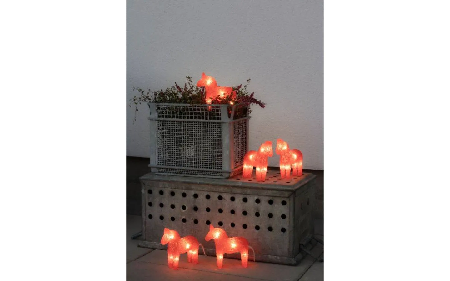 Små söta hästar i akryl från välkända Konstsmide. Hästarna är 12,5cm höga och försedda med LED-lampor som avger ett härligt varmvitt ljussken genom den röda akrylen.