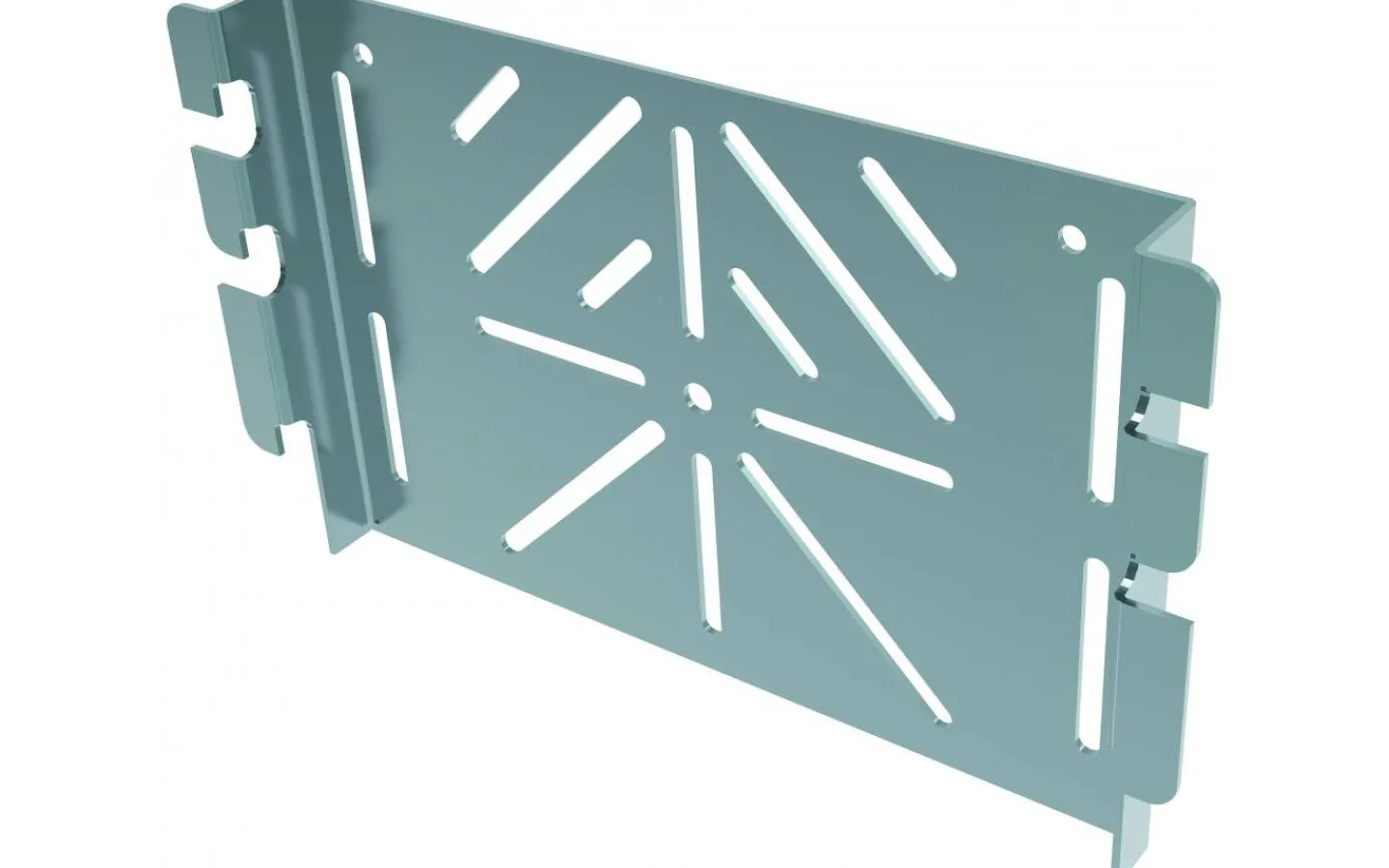 Dosplåt med slitsade spår för montage av större kopplingsdosor eller utanpåliggande vägguttag. Passar samtliga trådstegar. Sendzimirgalvaniserad (förgalvaniserad) med korrosivitetsklass C2. Fästet låses mot trådstegen med klämmor som böjs ned.