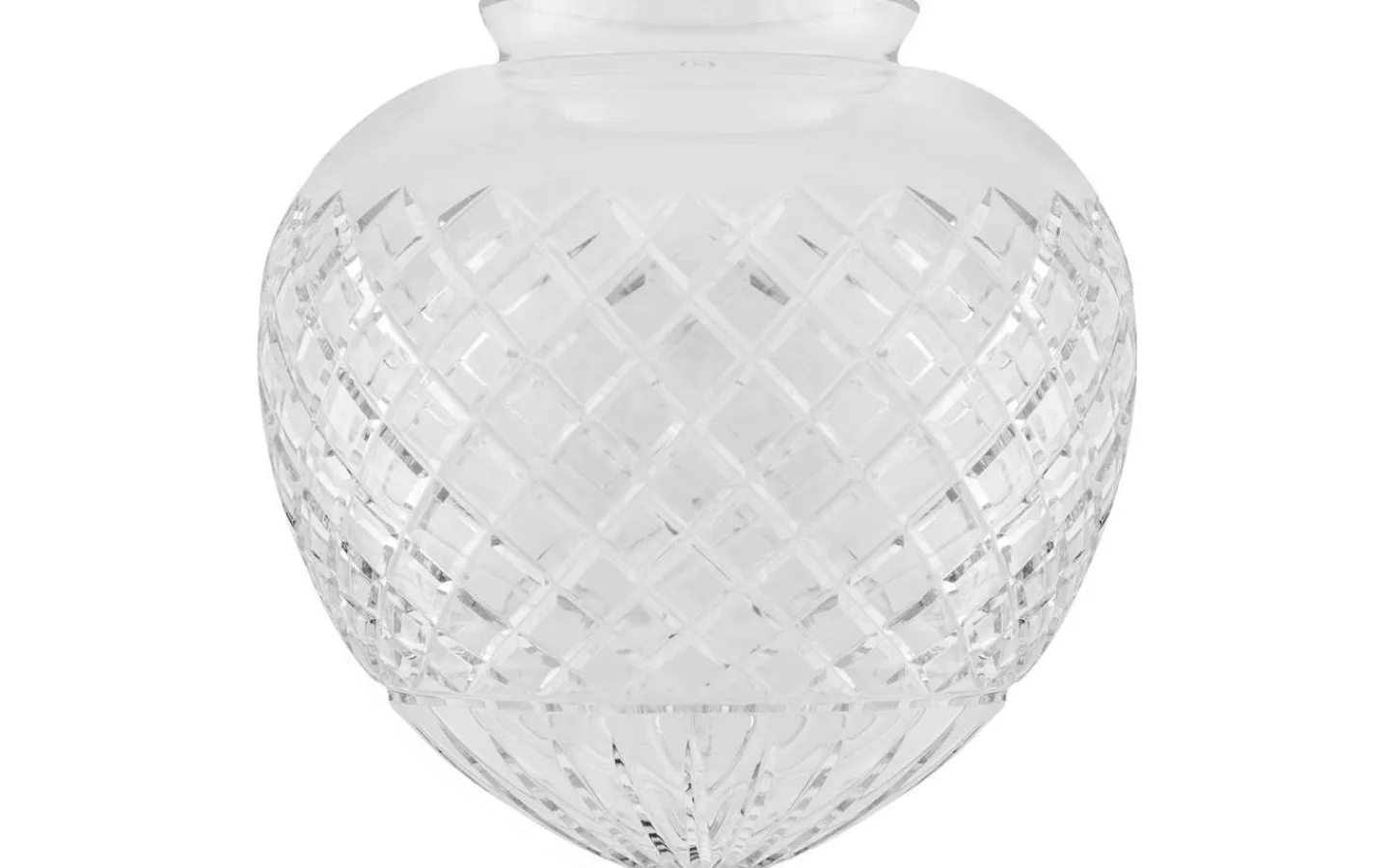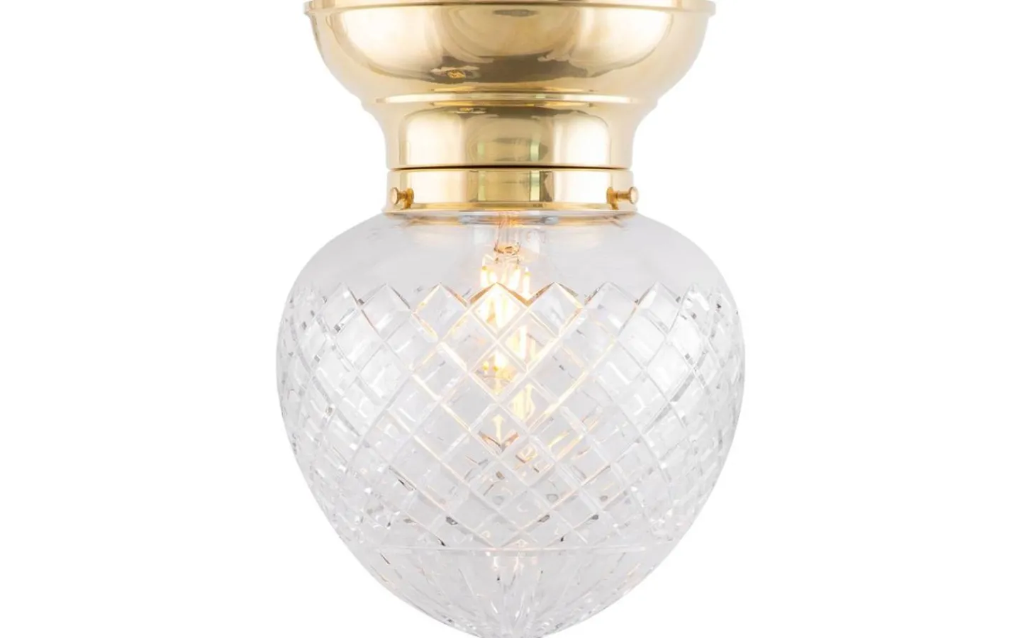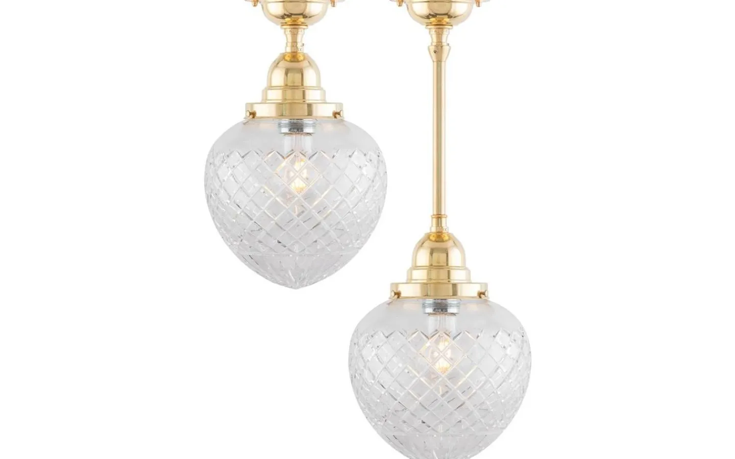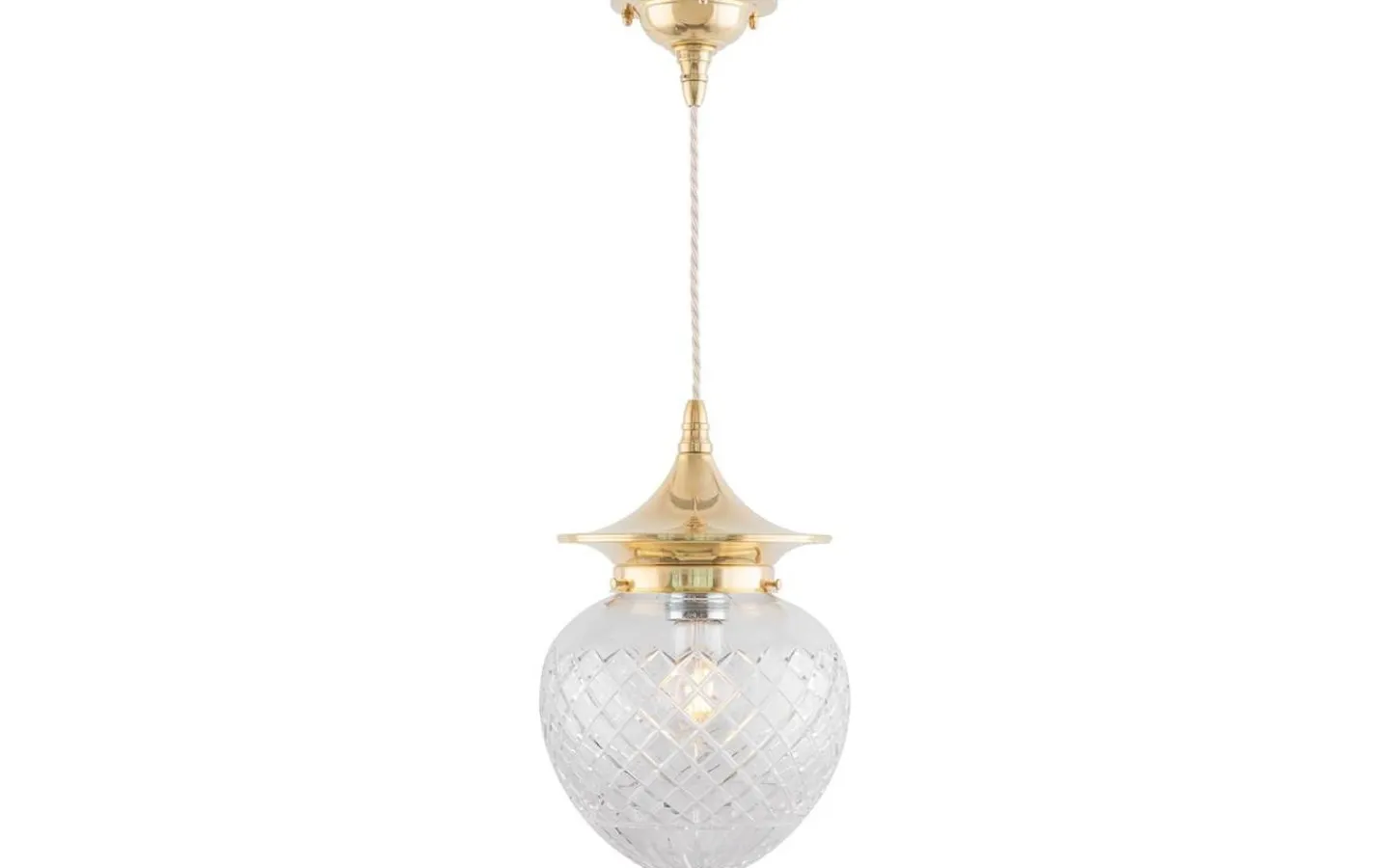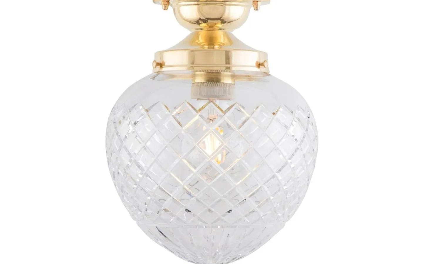 En klassisk kristallkupa i matterat klarglas med en slipad stjärna i toppen som ger ett mycket elegant och behagligt sken tillsammans med en ljuskälla av koltrådstyp. Detta droppformade glas förekom i vårt sortiment redan på 1890-talet.