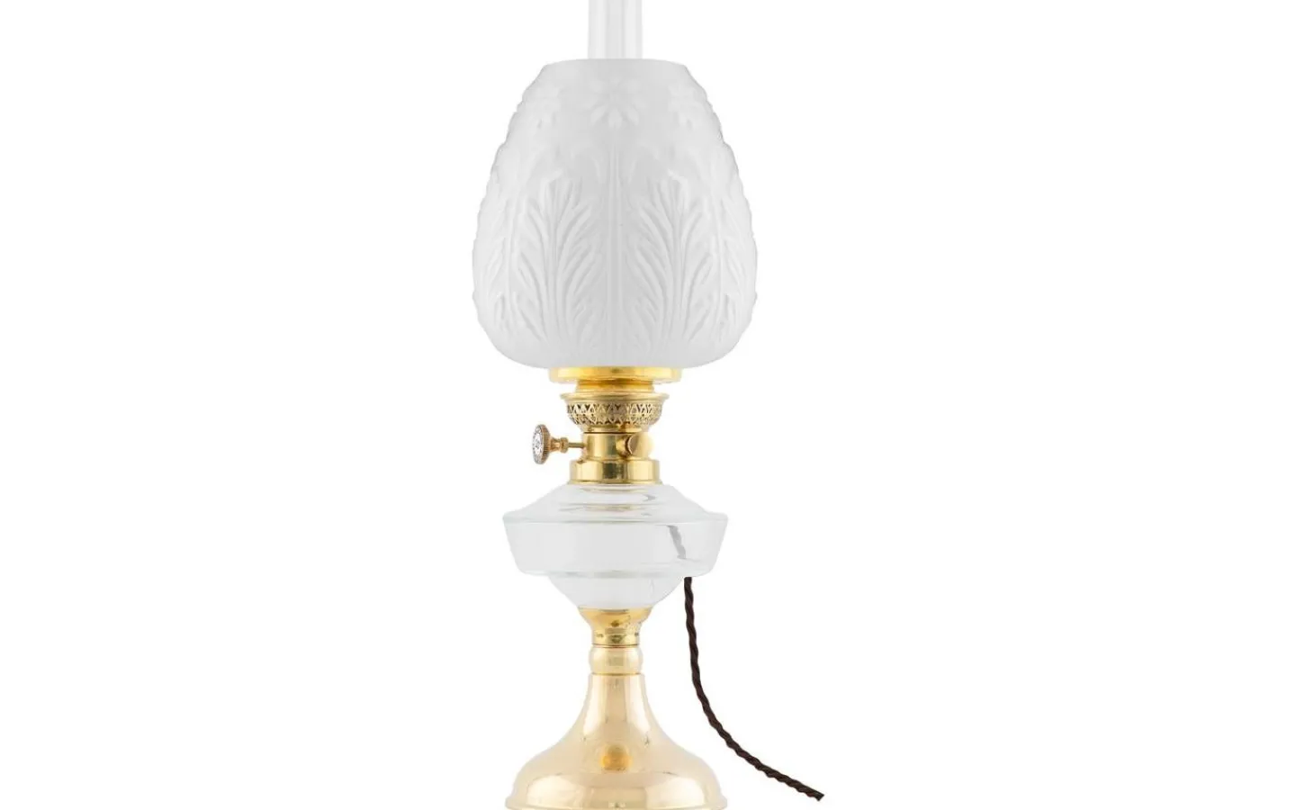 En elmonterad fotogenlampa med oljehus i klarglas som med sin enkla vackert böljande fot, är en riktig klassiker som i sitt originalutförande funnits med i vårt sortiment sedan 1890-talet.