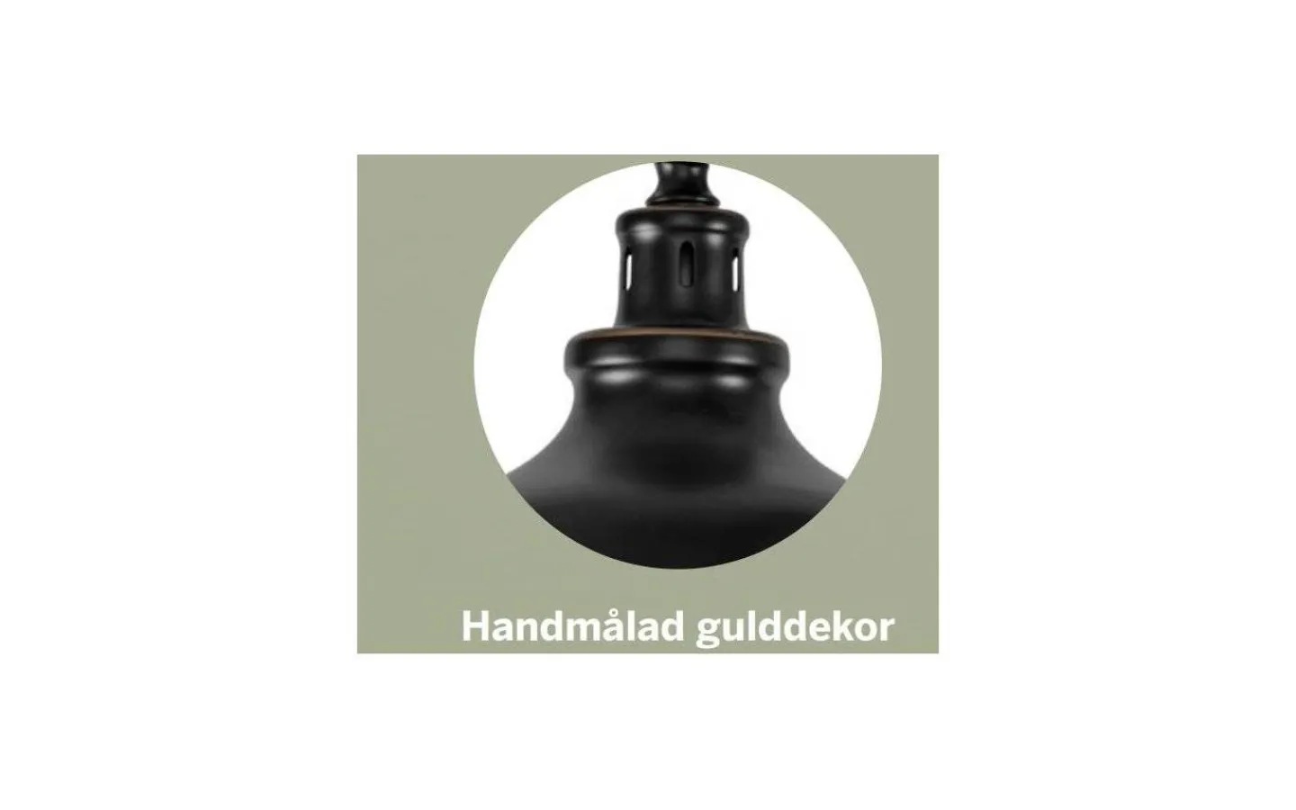 Denna vägglampa är gjord i metall med en antiksvart finish och handmålade detaljer i guld. Med sin raka arm, som du kan justera både i sidled och upp/ner, bygger lampan totalt 60 cm ut från vägg. Skärmen har vit insida och en diameter på 17,5 cm. Vägglampan levereras med 2 meter lång sladd med strömbrytare och stickkontakt för vägguttag.