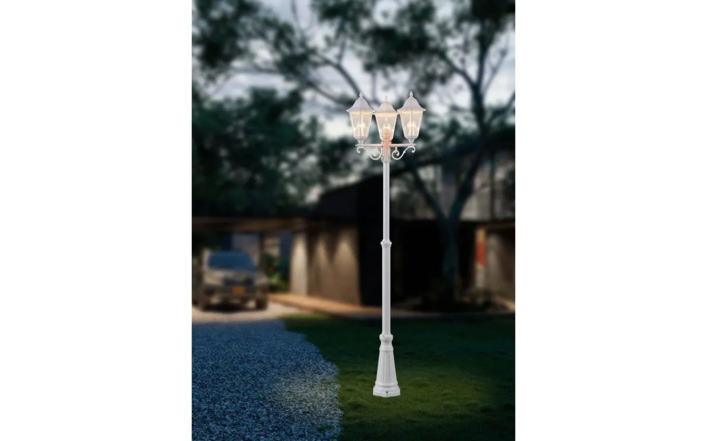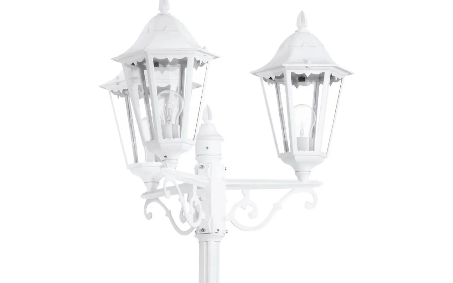 NAVEDO-väglampan i lyktstil har en kropp i vit gjuten aluminium och tre huvuden med klara glasrutor. Den yttre stolplampan är lämplig för utomhusbruk på grund av dess IP44-skydd mot sprutvatten. Produkten har en klassisk design som smälter in i utomhusutrymmen som stadsvillor i traditionell stil eller art nouveau.