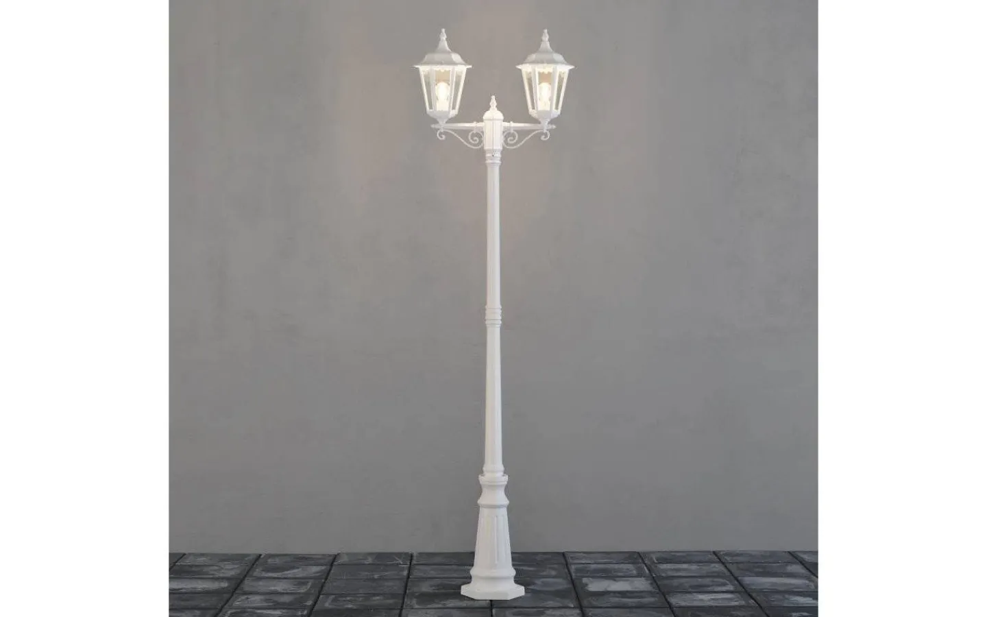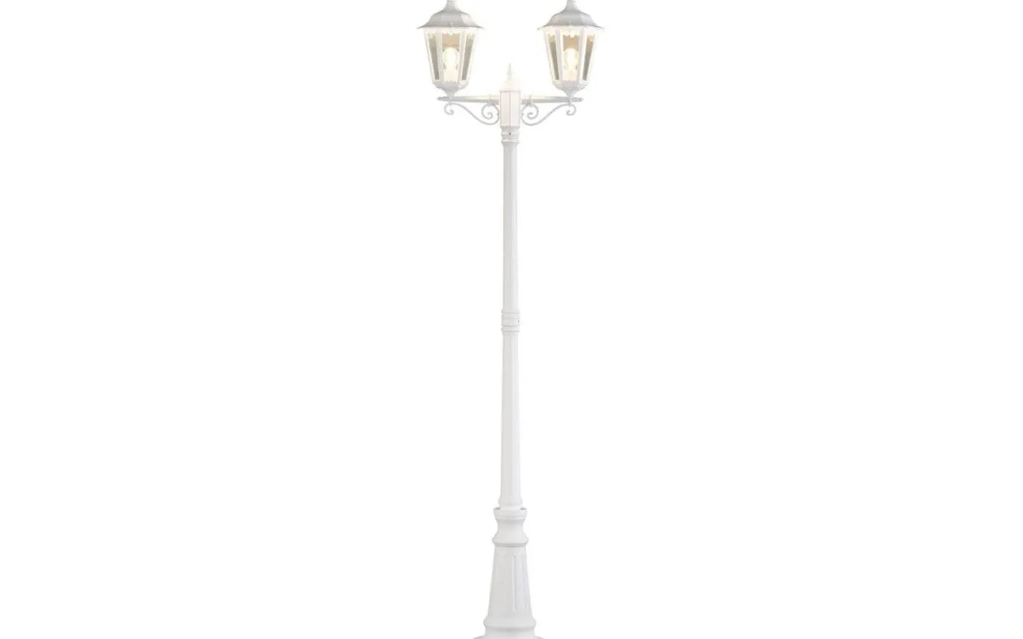 Stolplyktan är 2,2 meter hög, gjord i vit aluminium och har en en vacker tvåarmad lykta med klarglas.