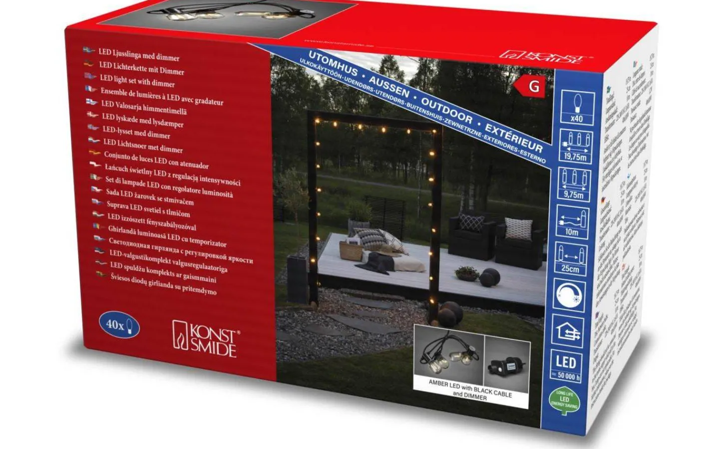 Denna festliga partyslinga från Konstsmide är 9,75m lång med 40st klara lampor som lyser upp i ett extra varmvitt ljussken. Slingan är IP44 klassad vilket innebär att denna går att hänga utomhus. Perfekt att dekorera med till årets alla festligheter!