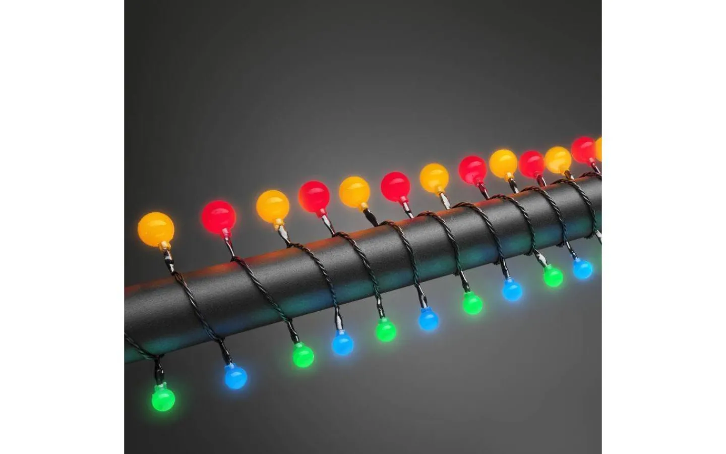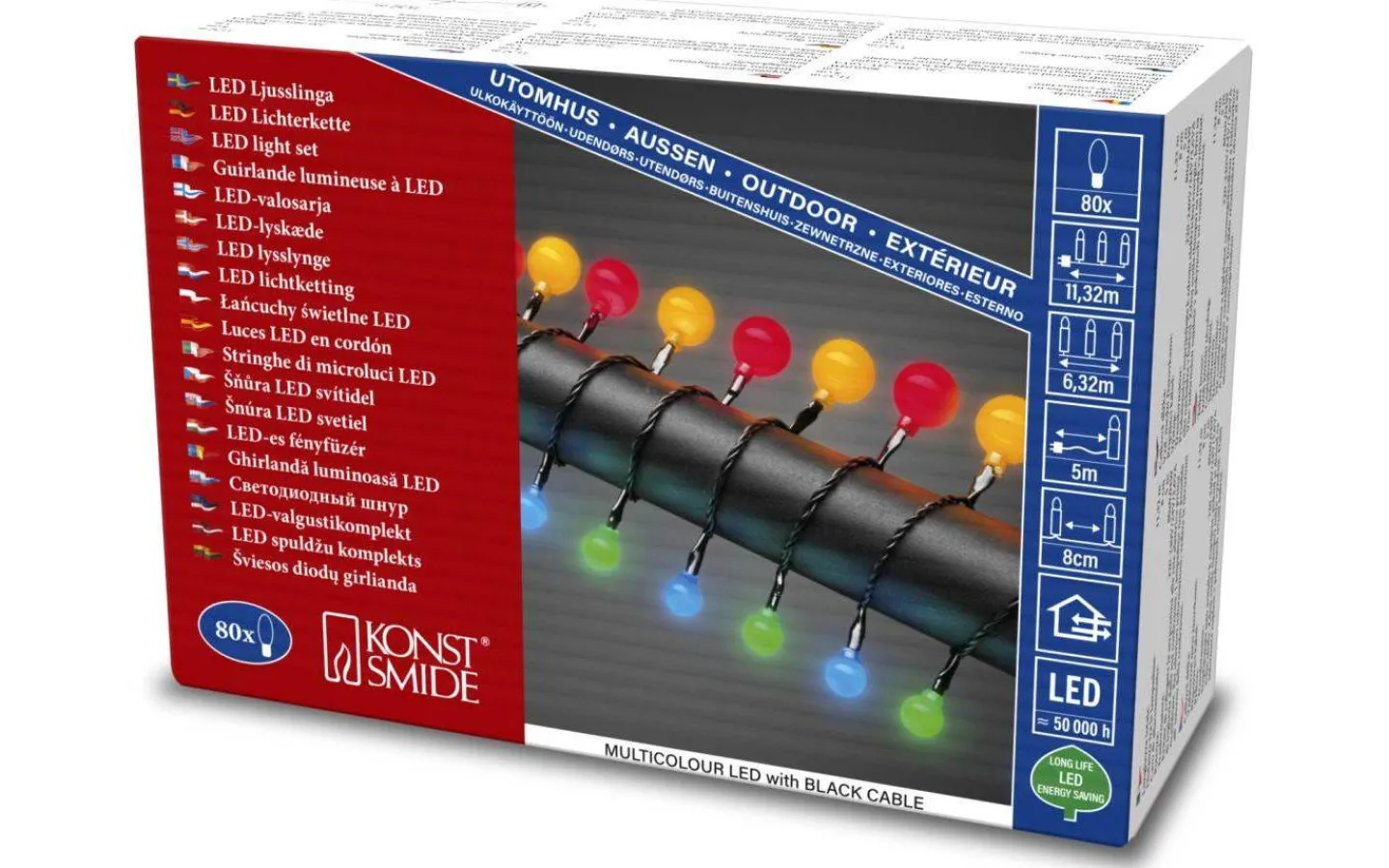 Cherry ljusslinga från Konstsmide är 6,32m lång med 80st färgade glober. Inuti varje glob sitter en liten LED-lampa som avger i ett varmvitt ljussken. Med sin IP44 klass är denna slinga perfekt att dekorera med utomhus för att skapa en härlig atmosfär i nattens mörker.
