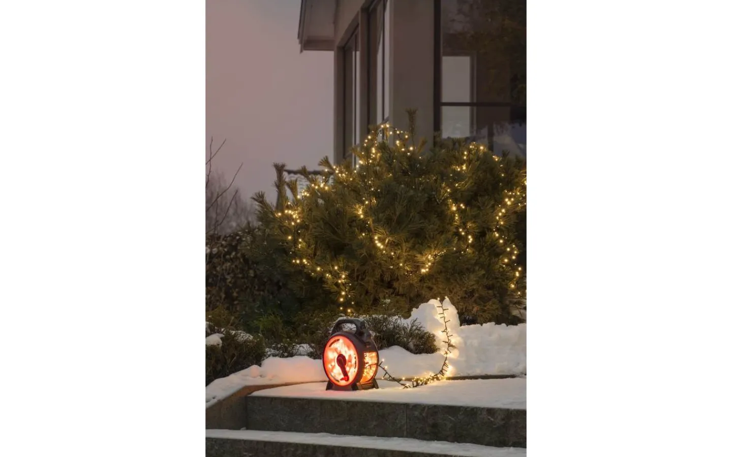 Smart sladdvinda gör både montering och förvaring smidigt. Ljusslingan med varmvita LED sitter redan på plats – du vevar bara ut när det är dags att dekorera och vevar tillbaka när du är klar. Inget trassel, enkel förvaring och alltid redo för nästa säsong. Energibesparande LED och tålig för utomhusbruk.