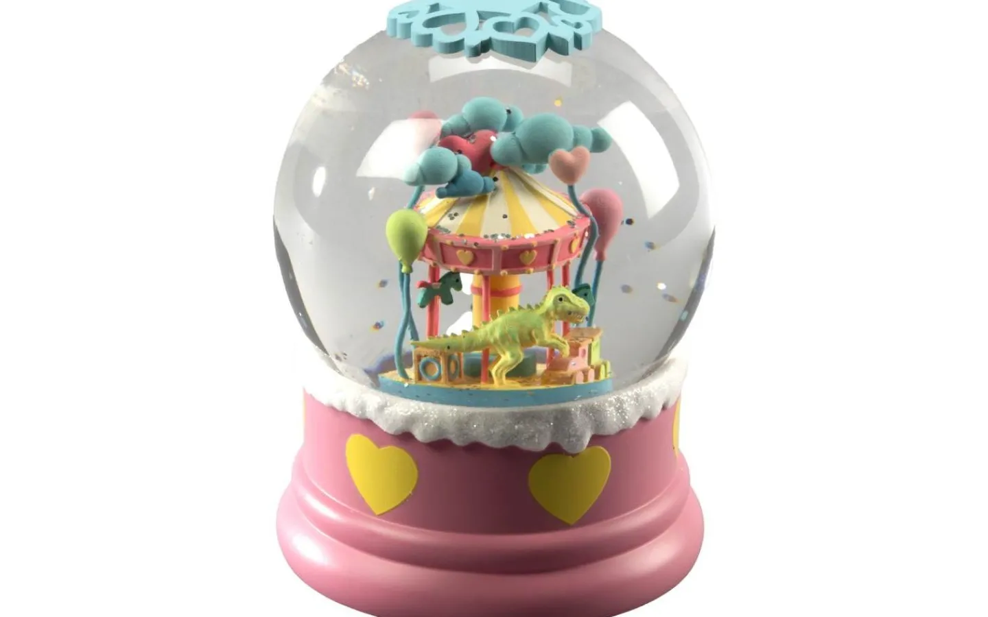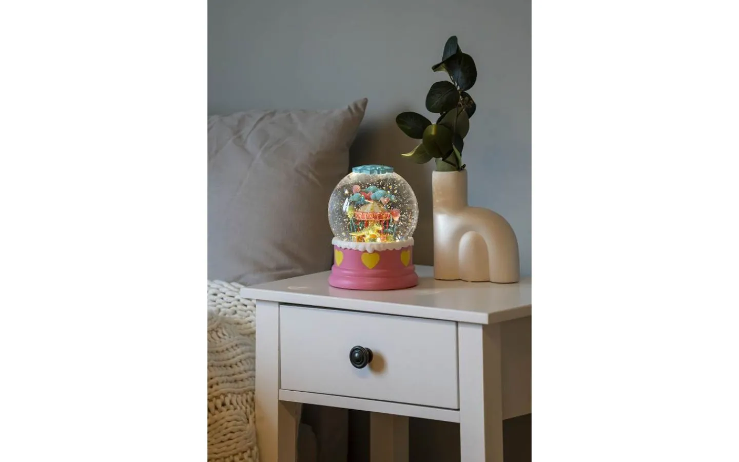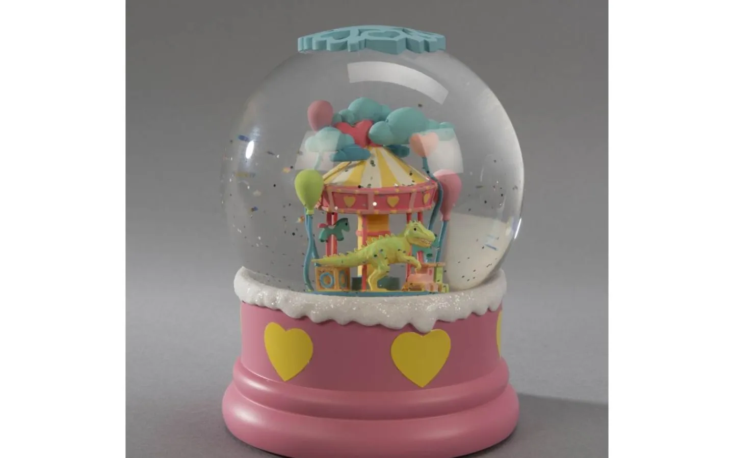 Snöglob med karusell och dinosaurie, omgiven av ballonger, moln och virvlande glitter. Varmvit LED och timer på 5 timmar. Drivs med 3xAAA batterier (ingår ej). Höjd 16,5 cm, bredd 12,5 cm.