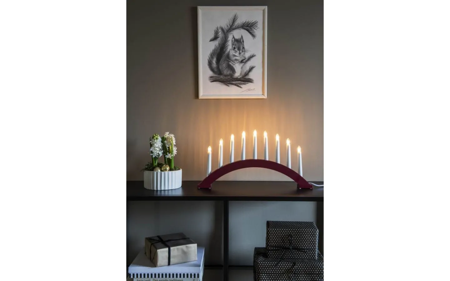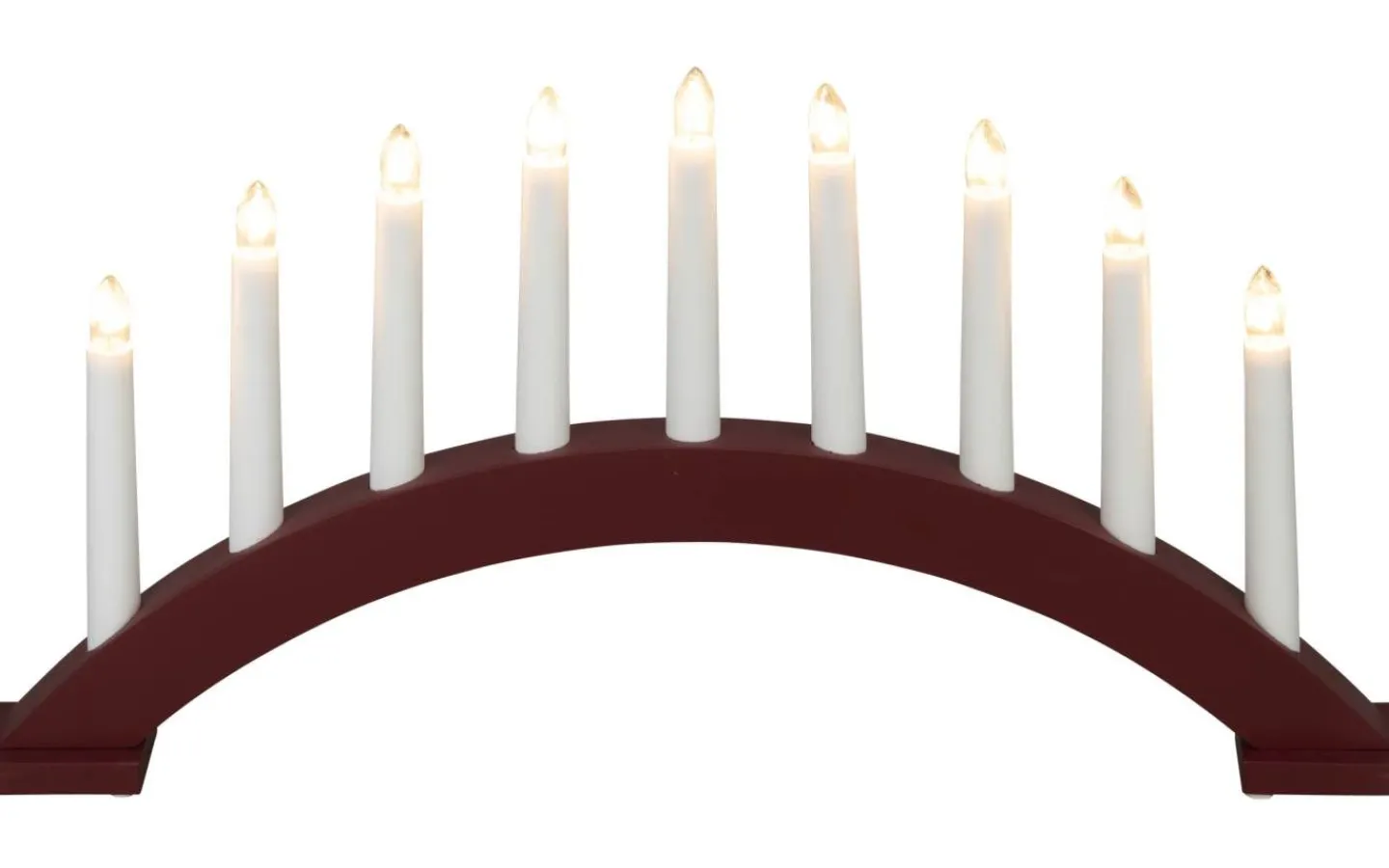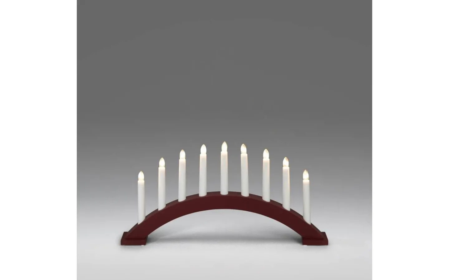 Klassisk 9-armad adventsljustake, båge med varmvita lampor. Matt rödlackad. Anslutningssladd på 1,7 meter. Strömbrytare. Höjd 25,5 cm och bredd 49 cm.