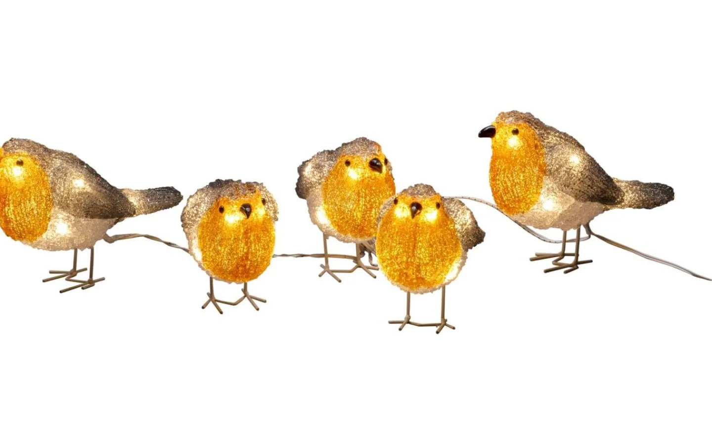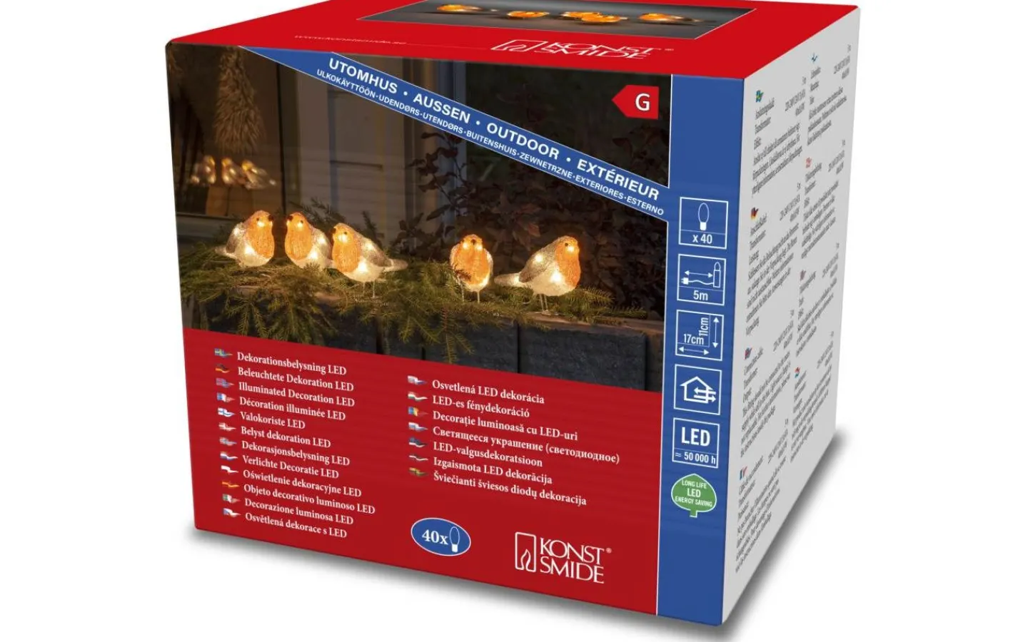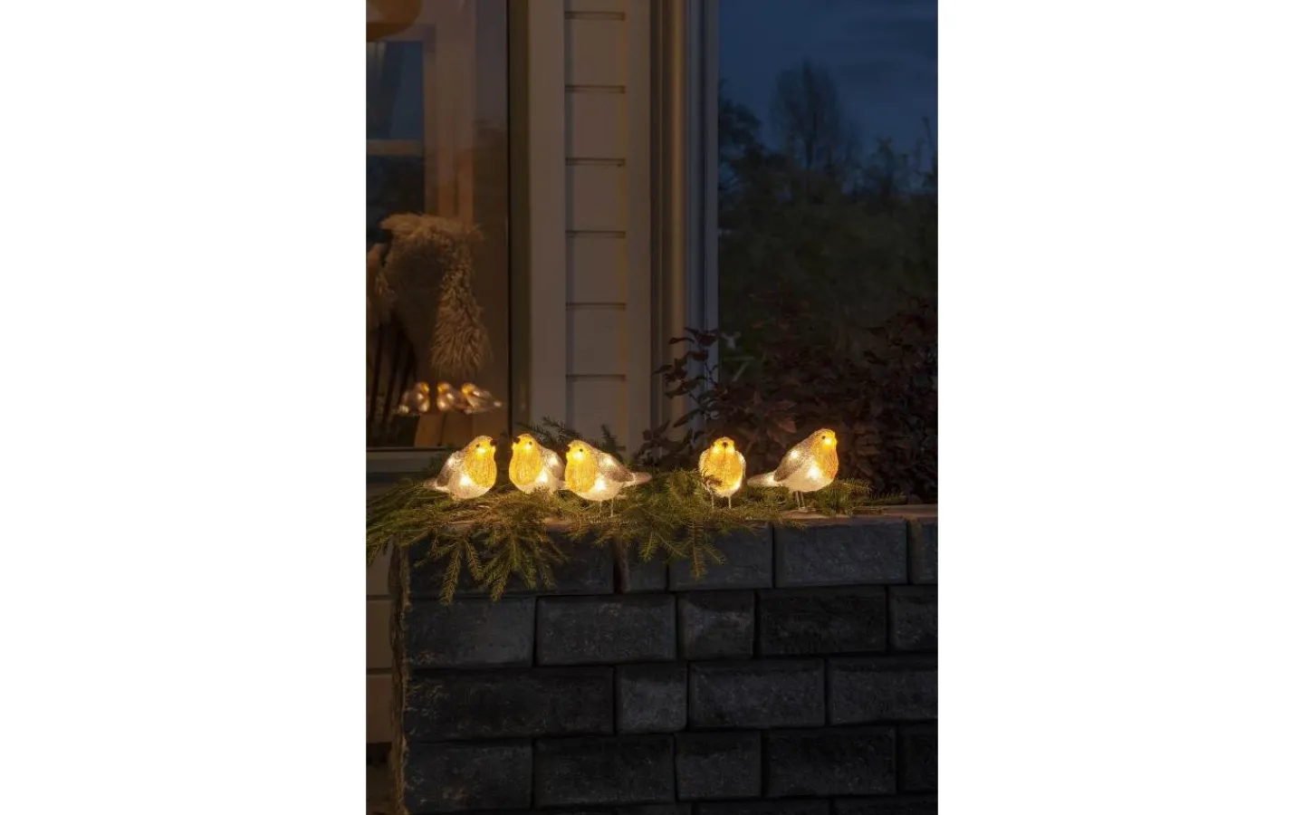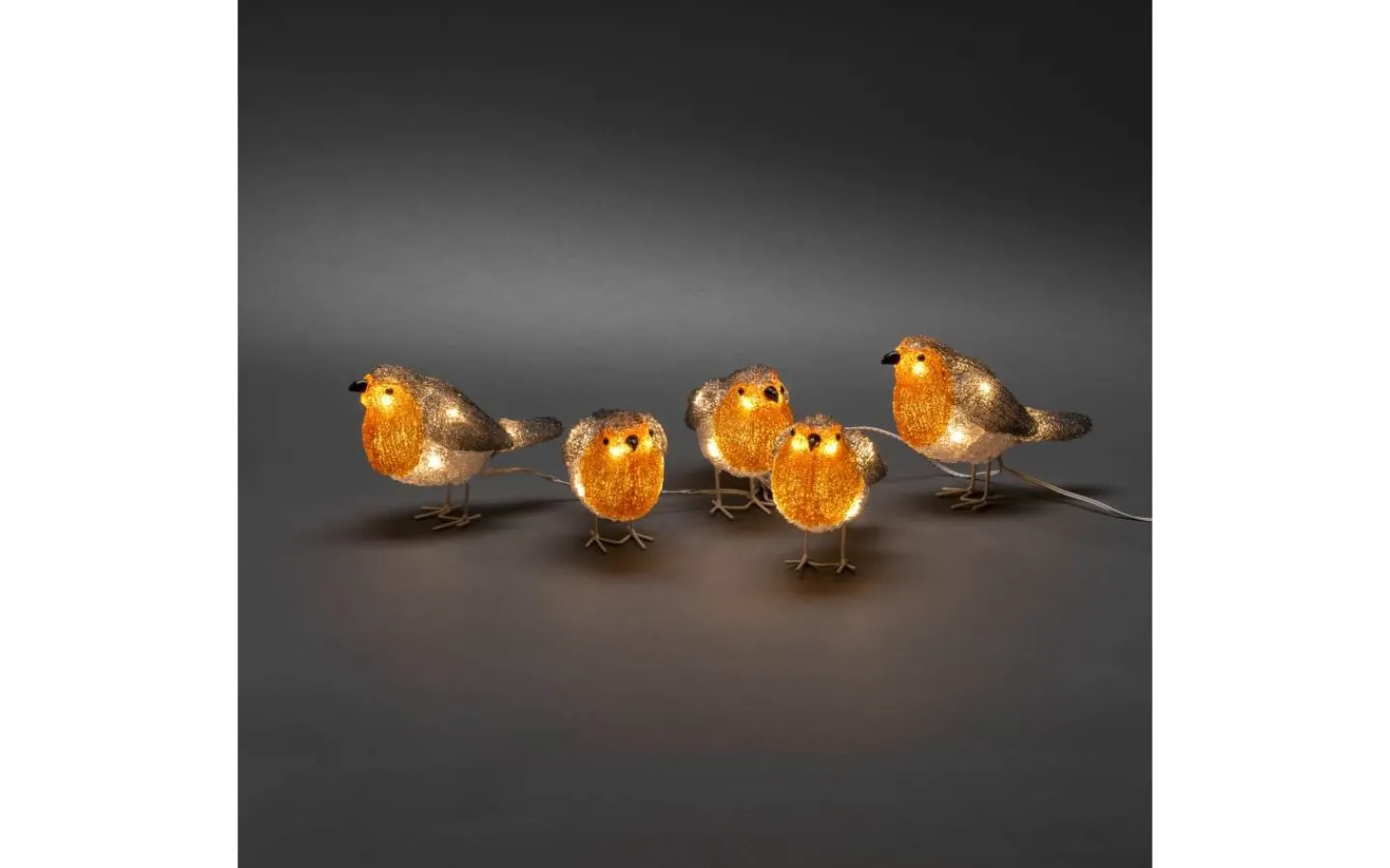 Dekorativ ljusslinga med små rödhakar i akryl. Denna ljusslinga från Konstsmide blir helt klart en härlig utomhusdekoration till jul!
