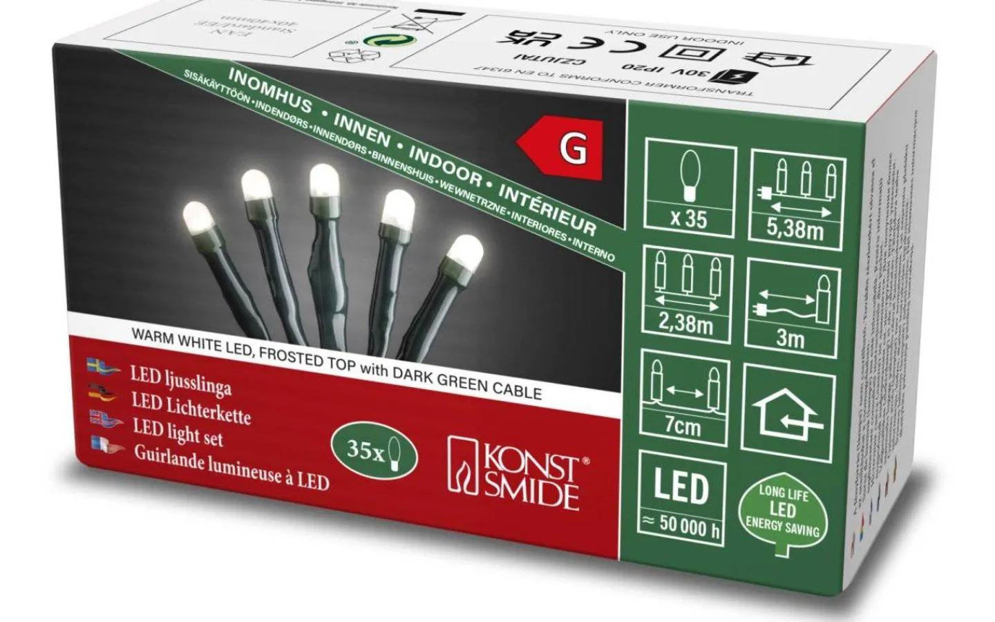 Mini ljusslinga från Konstsmide har 36st små frostade LED-lampor som lyser upp i ett härligt varmvitt ljussken. Slingan är 2,38m lång.