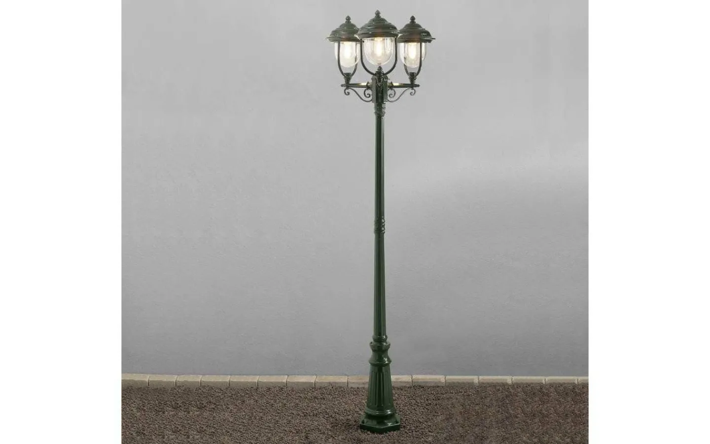 Stolplyktan är 2,2 meter hög, gjord i grön aluminium och har en en vacker trearmad lykta med klarglas.