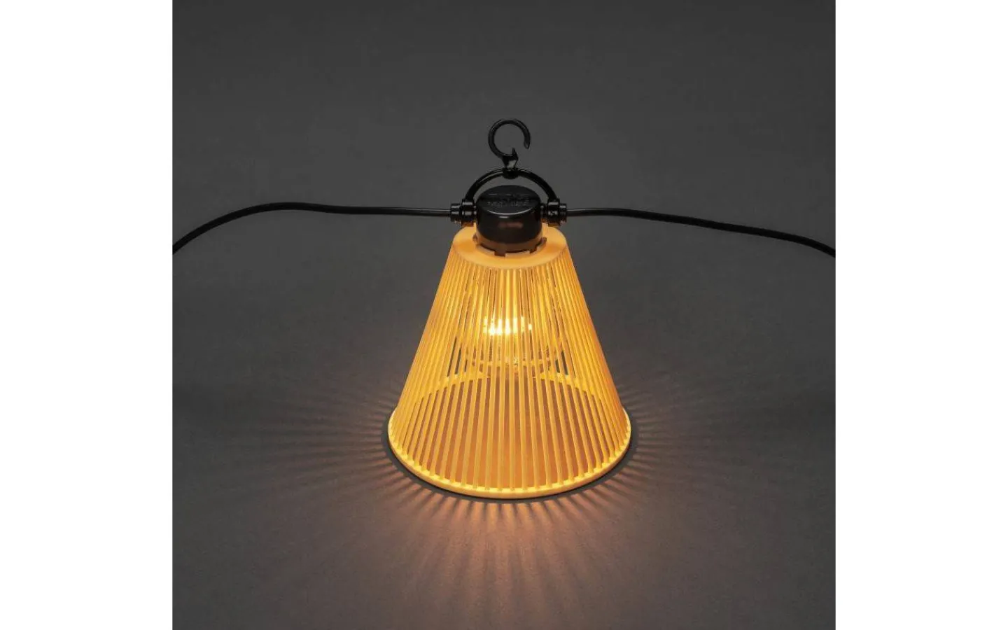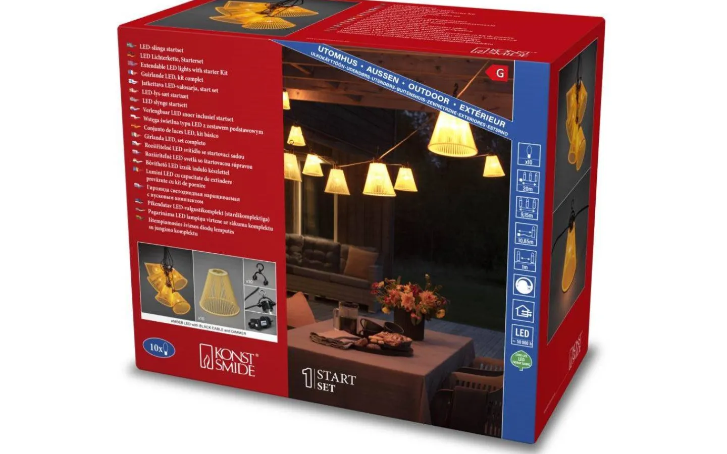Härlig utomhusdekoration från Konstsmide. Ljusslingan är 9,15m lång med 10st gula skärmar. Inuti varje skärm sitter en klar lampa som lyser i ett varmvitt ljussken. Slingan är IP44 klassad vilket innebär att denna går att placera utomhus. Denna slinga är ett startpaket, önskar du en längre slinga finner du Skärm Ljusslinga Extra under ”Tillbehör”.