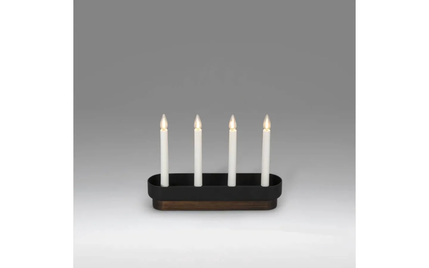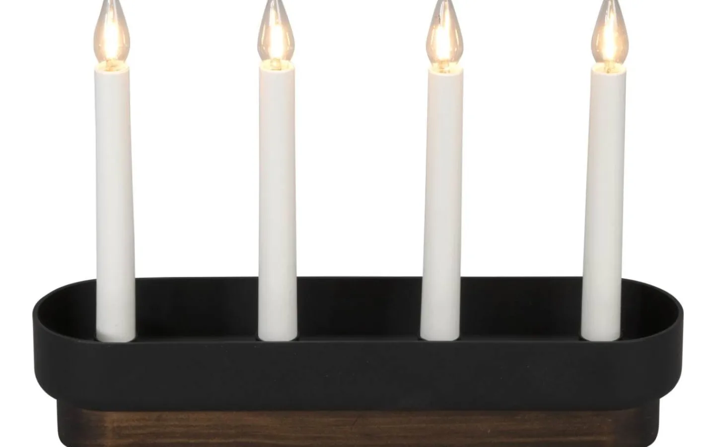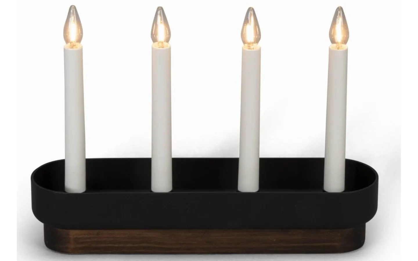 Modern 4-armad adventsljusstake i valnöt/svart trä och plast. Varmvit LED. Anslutningssladd på 170cm med sladdströmbrytare för manuell avstägning/påslagning. Höjd 23,5cm och bredd 31,5cm.