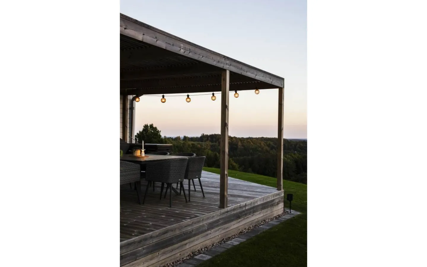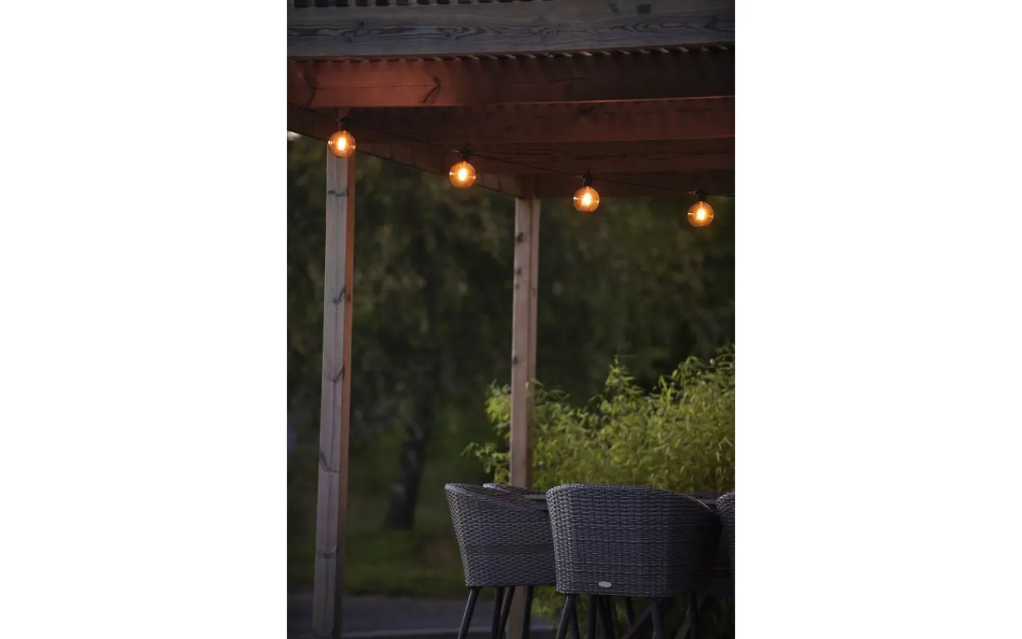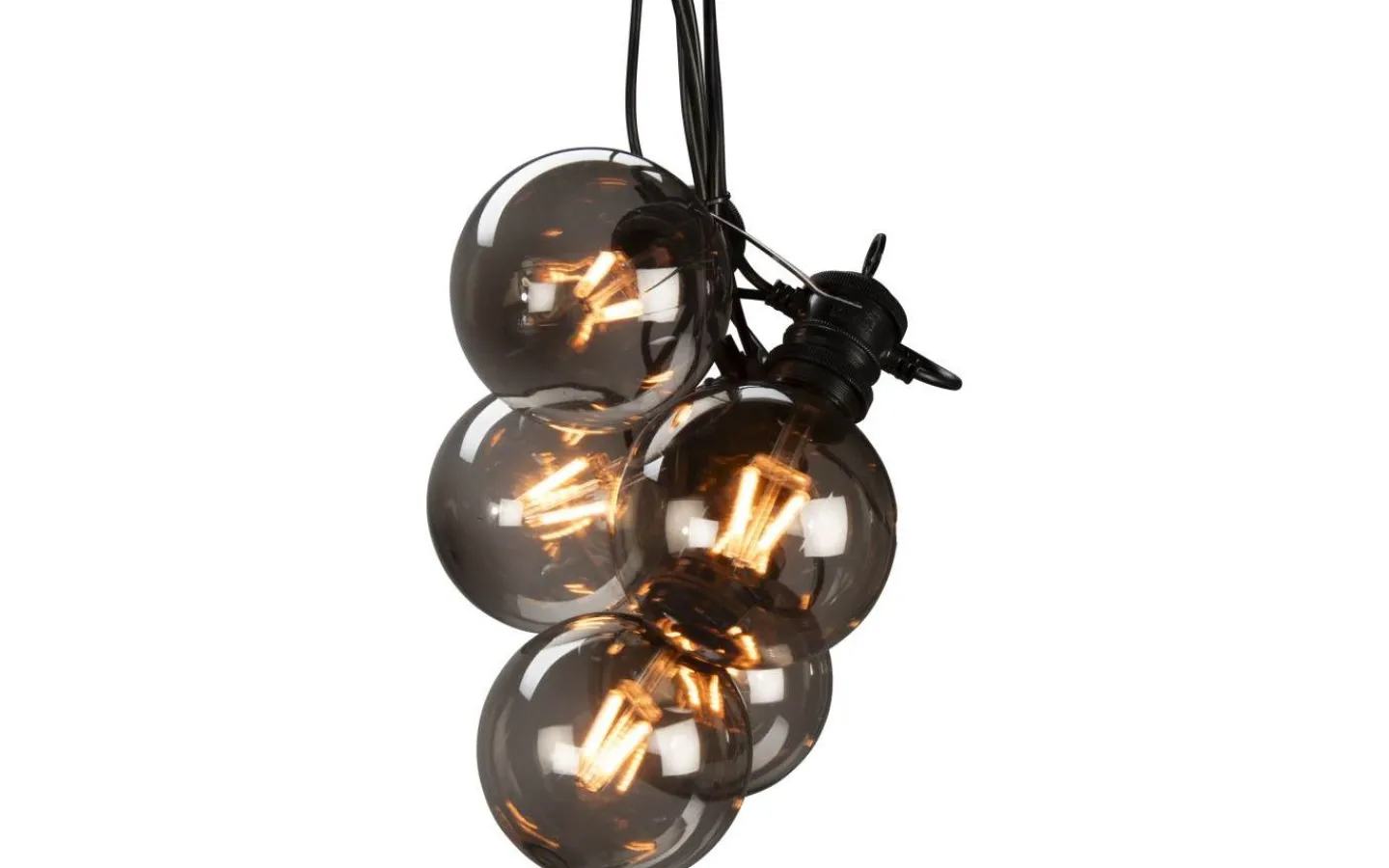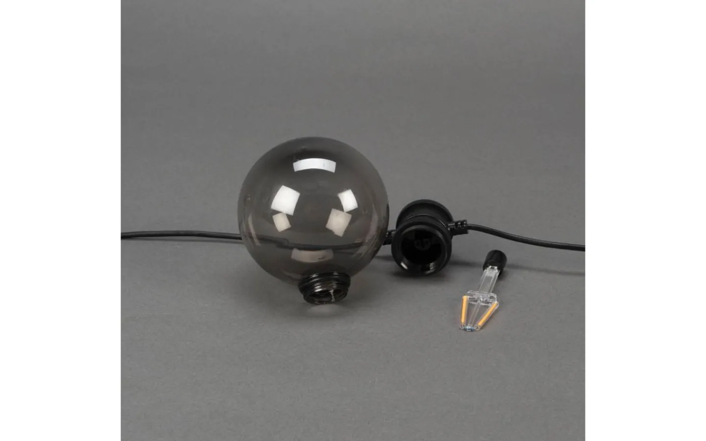 Partyslinga för uteplatsen eller växthuset, med 10 st gråa rökfärdade kupor och utbytbara LED. Inbyggd dimmer/timer och lampavståndet är 50 centimeter. Anslutningssladden är 10 meter vilket ger en totallängd på 14,5 meter.
